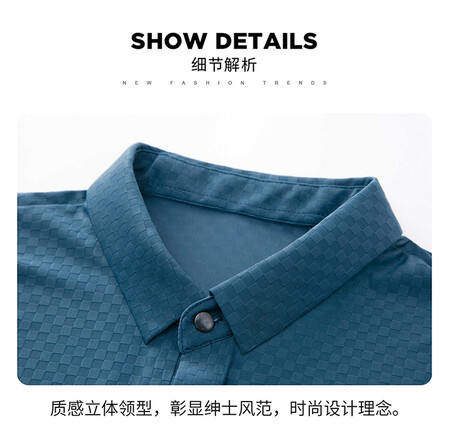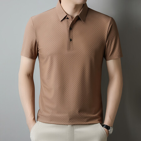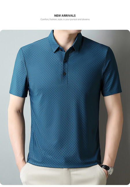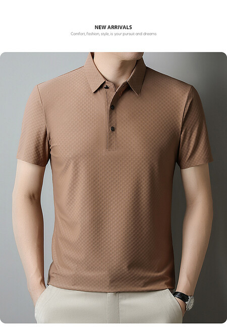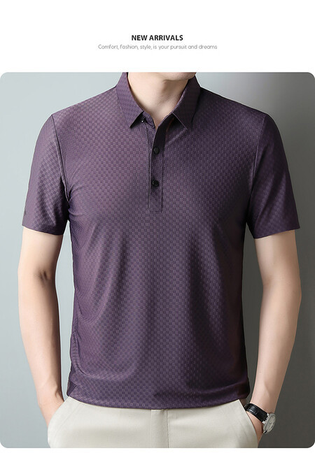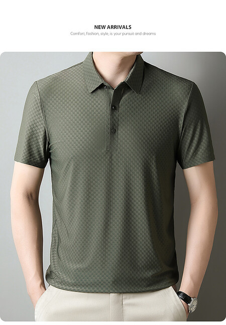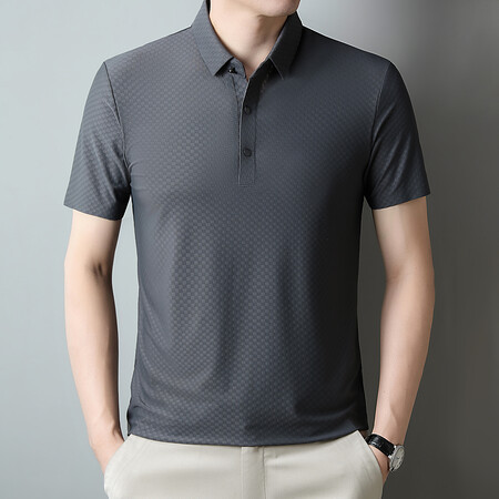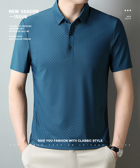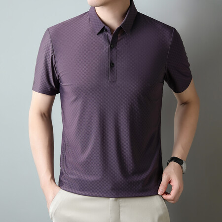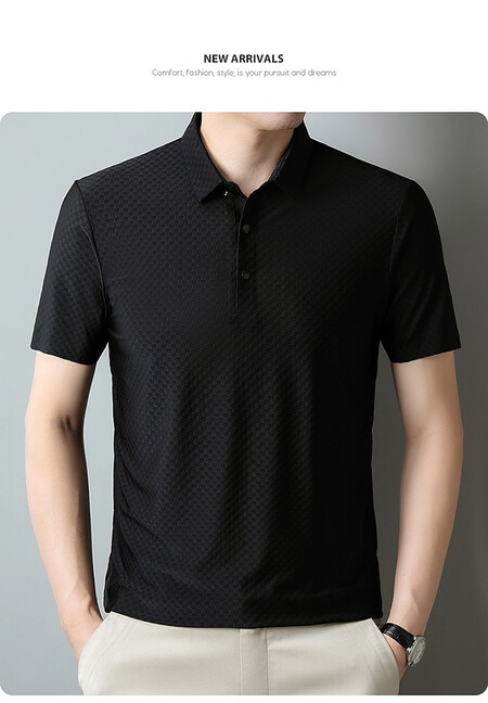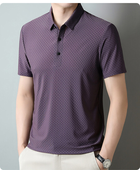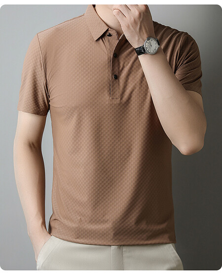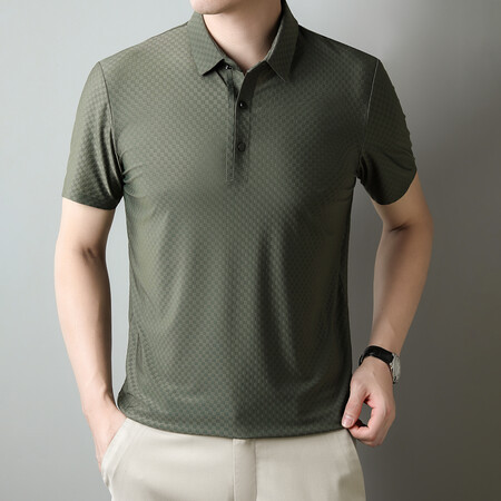 여름 새 남성용 반팔 티셔츠 라펠 세미-이음매없는 스트레치 실크 자카드 다크 체크 얇은 슬림 핏 하프 슬리브
