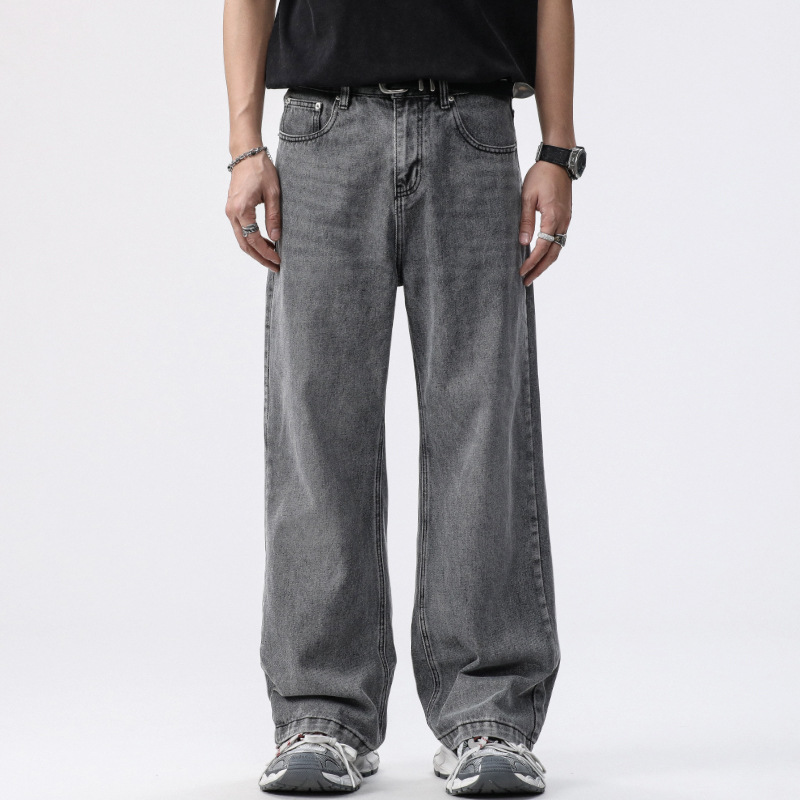 무추 남성복∣미국식 하이 스트리트 레트로 워싱 블랙 그레이 데님 팬츠 남성용 루즈핏 클린핏 롱 팬츠