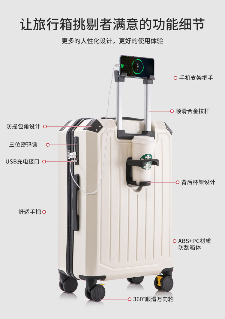 2023 새로운 남성 및 여성용 충전식 다기능 수하물 대용량 트롤리 케이스 고가 여행 비밀번호 가죽 케이스스토어 가기