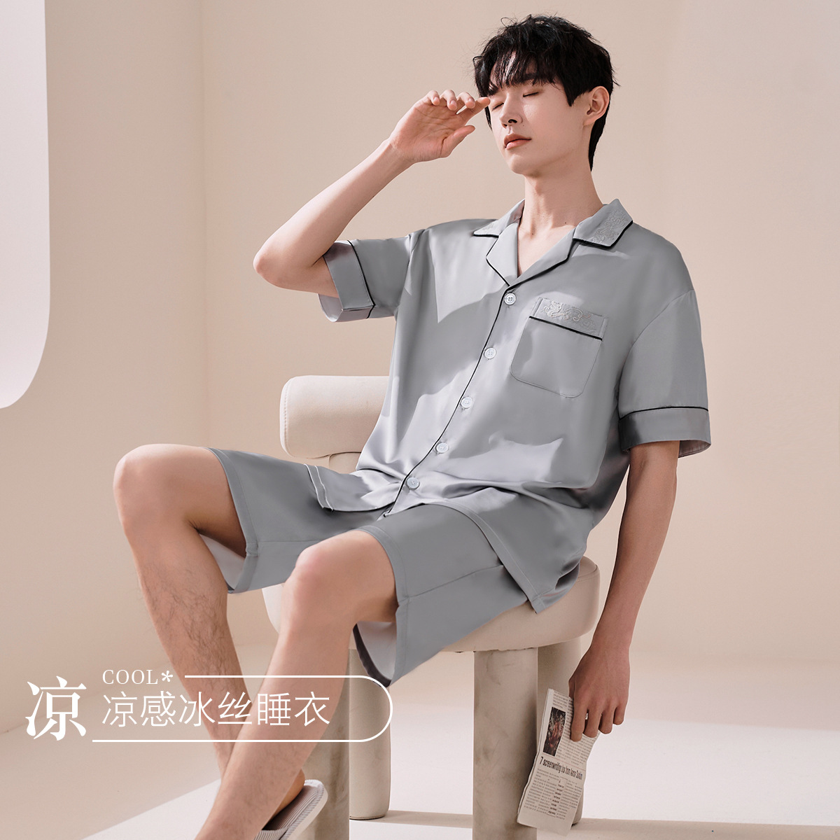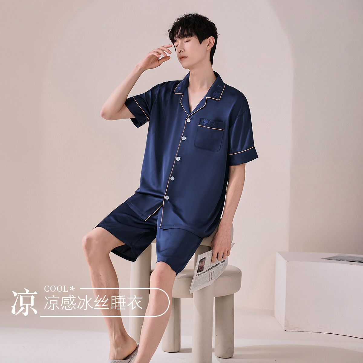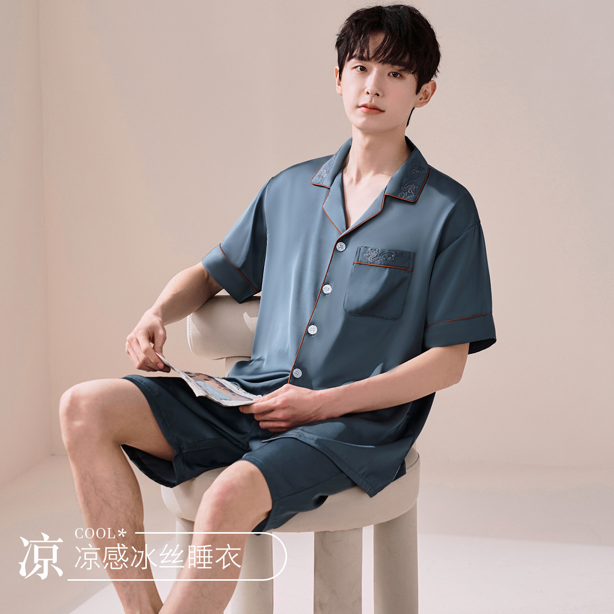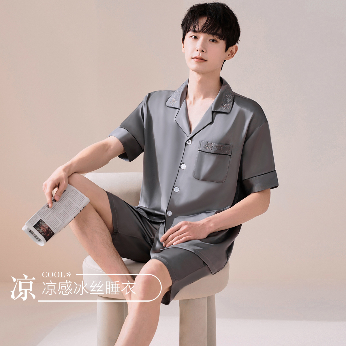 2023 잠옷 남자의 여름 반팔 반바지 아이스 실크 고급 봄과 여름 실크 가정 옷 블랙 세트스토어 가기