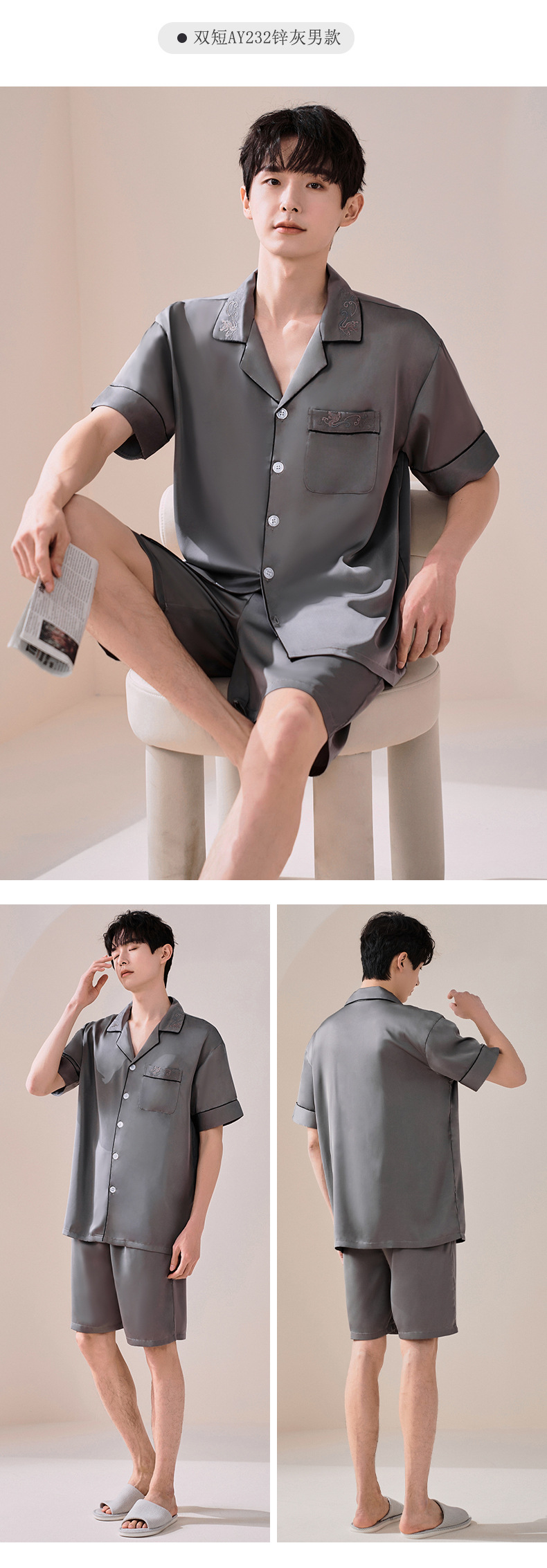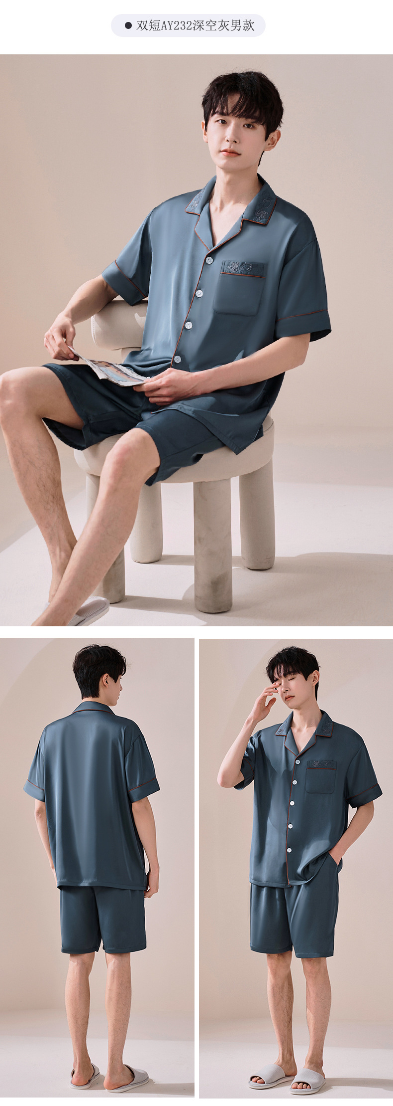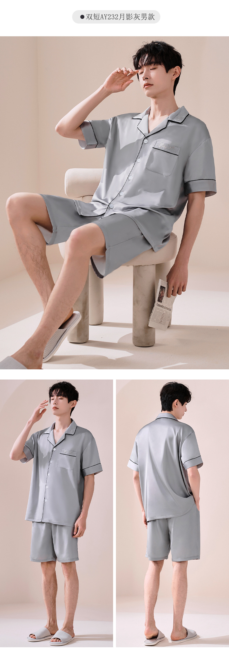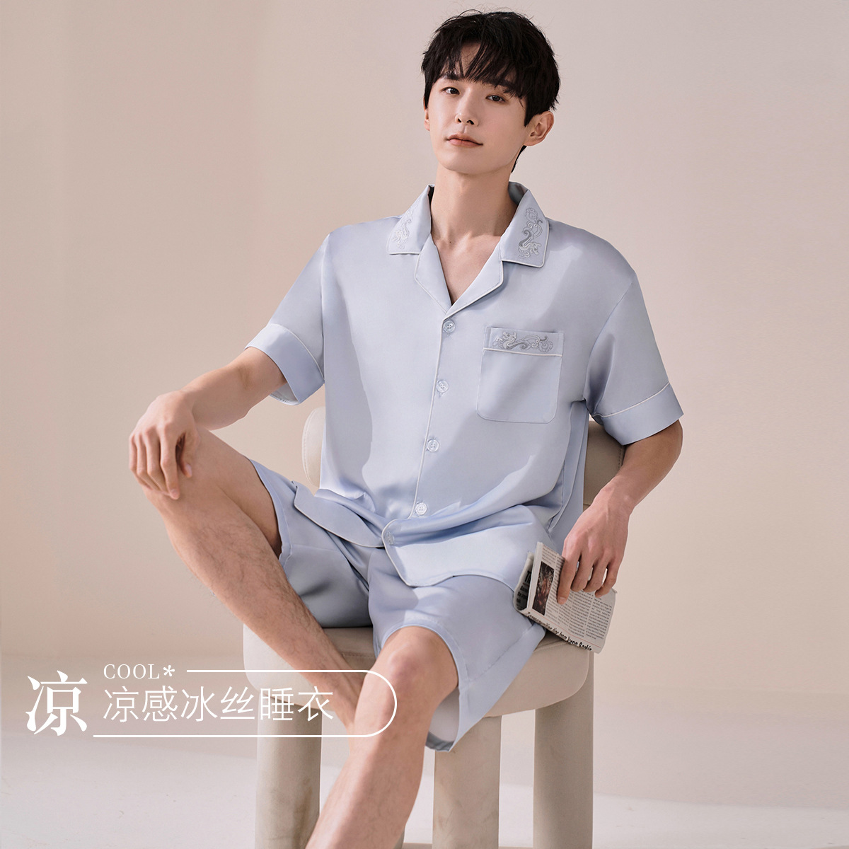 2023 잠옷 남자의 여름 반팔 반바지 아이스 실크 고급 봄과 여름 실크 가정 옷 블랙 세트스토어 가기