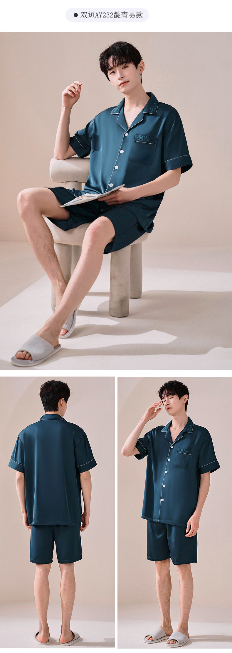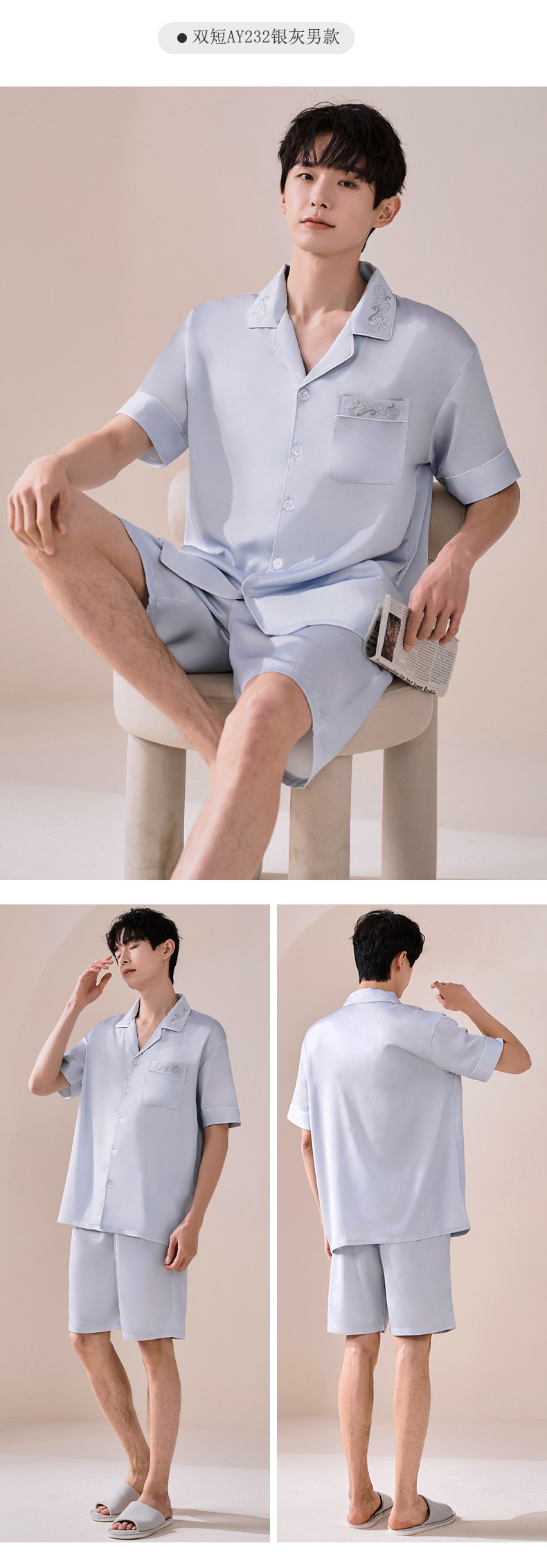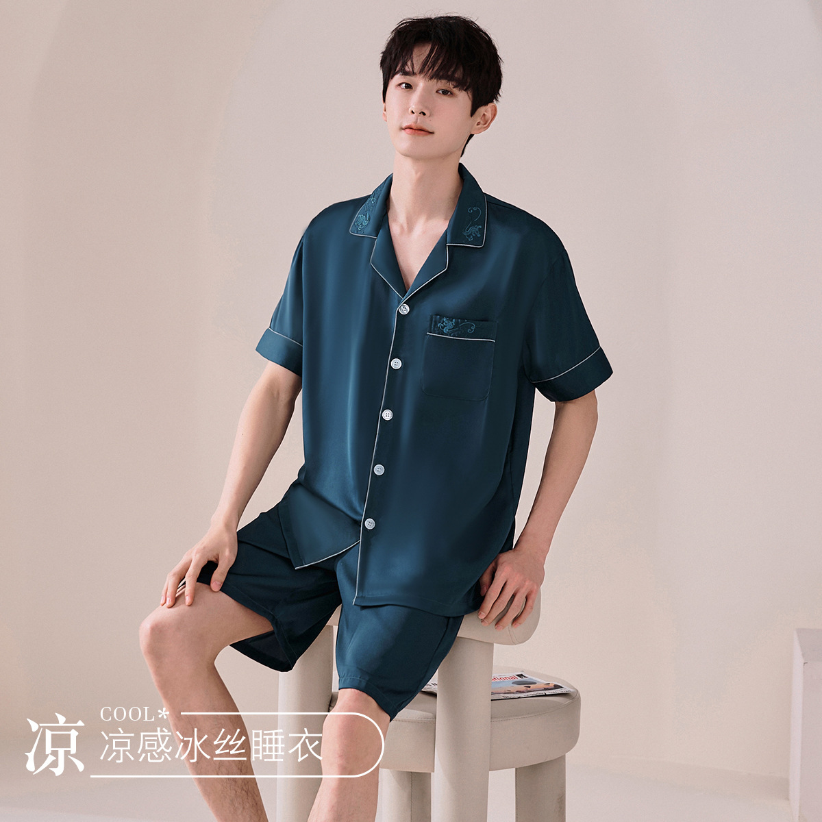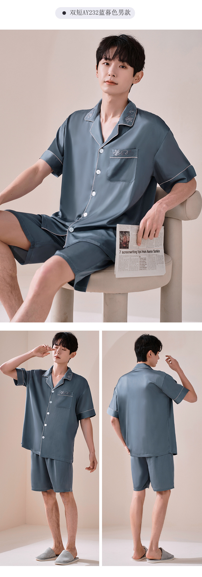 2023 잠옷 남자의 여름 반팔 반바지 아이스 실크 고급 봄과 여름 실크 가정 옷 블랙 세트스토어 가기