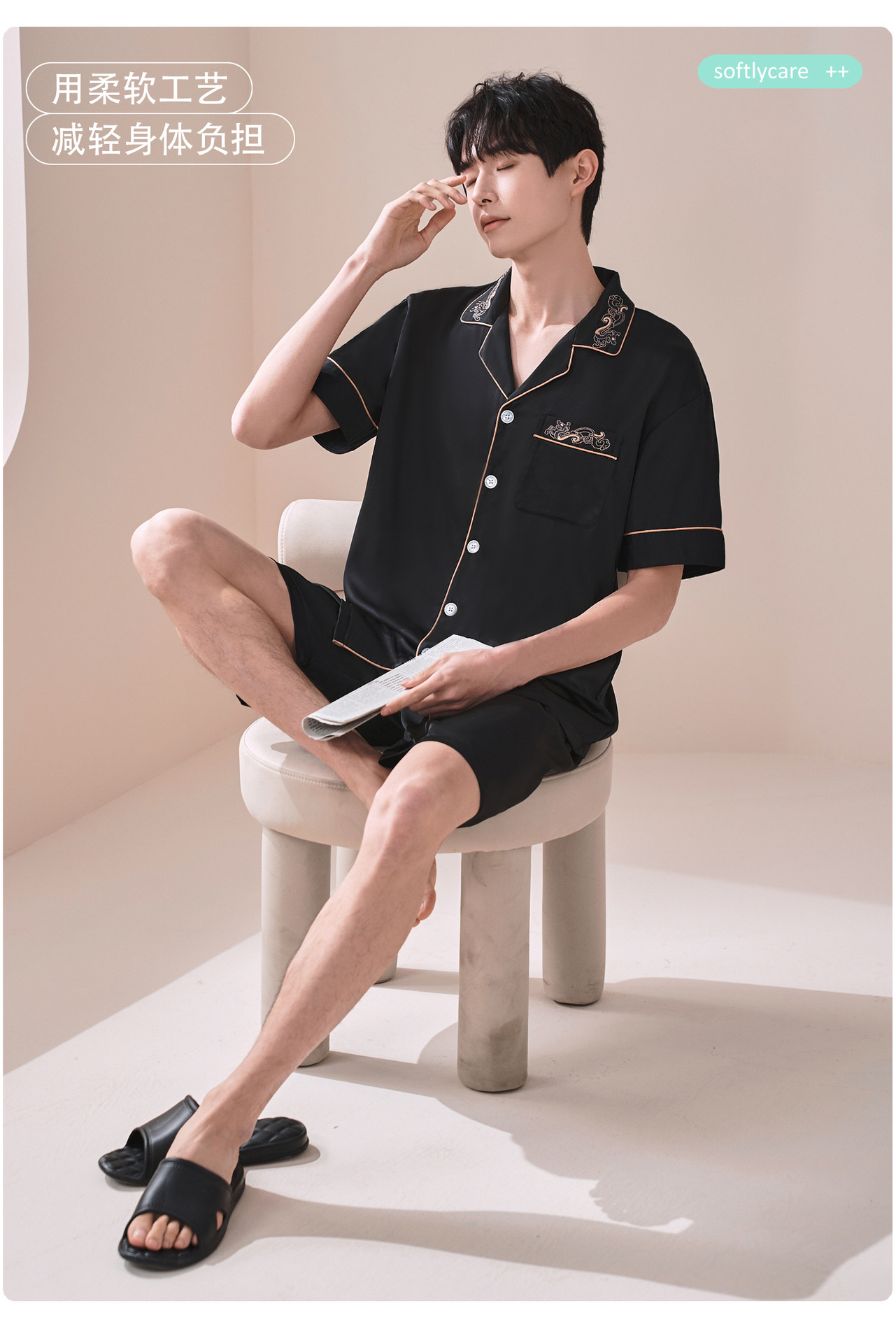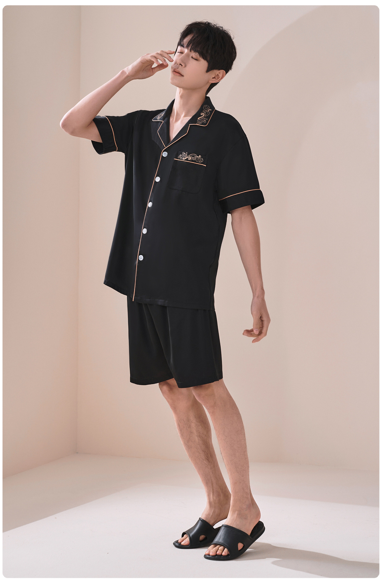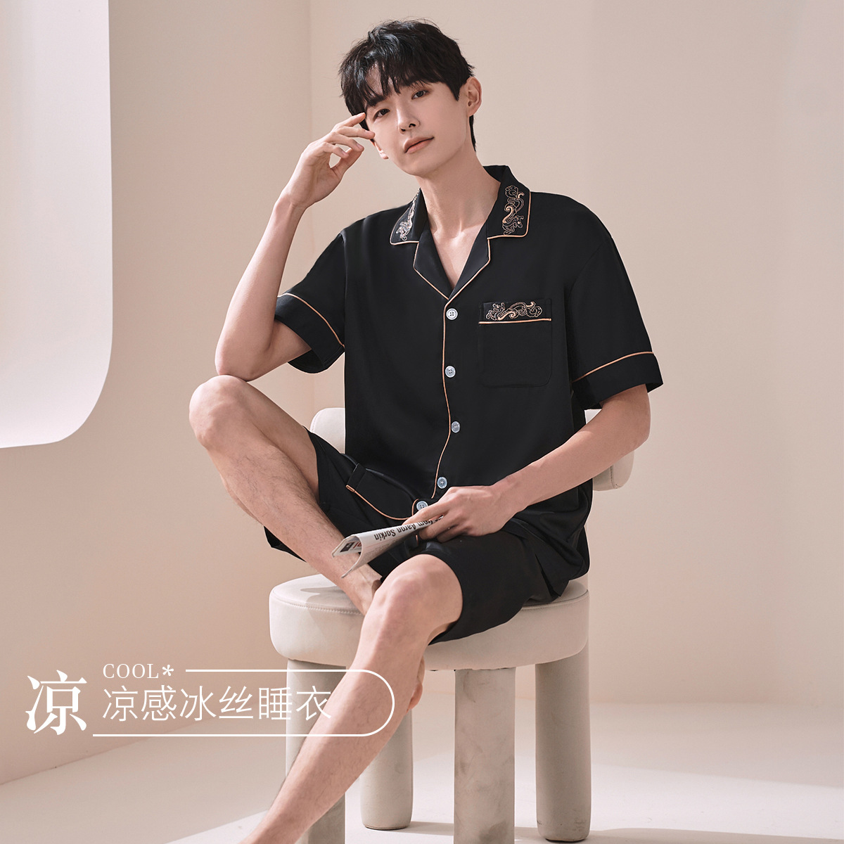 2023 잠옷 남자의 여름 반팔 반바지 아이스 실크 고급 봄과 여름 실크 가정 옷 블랙 세트