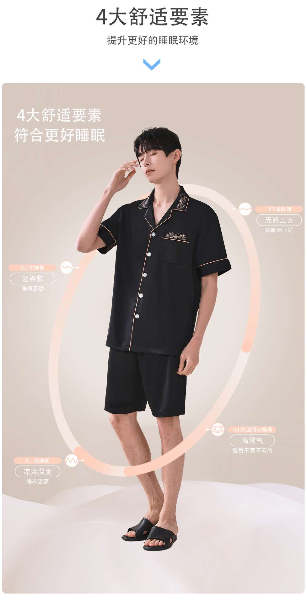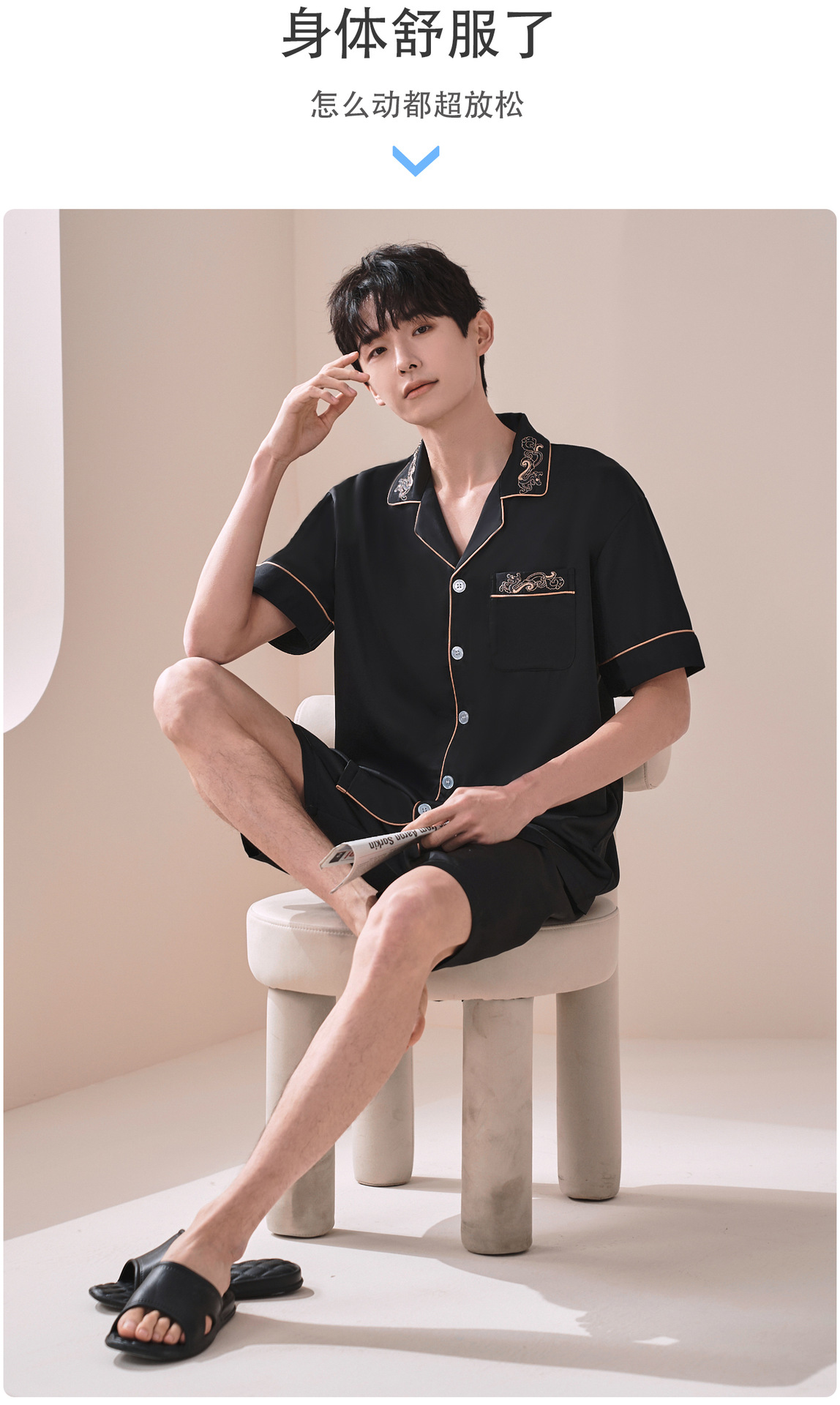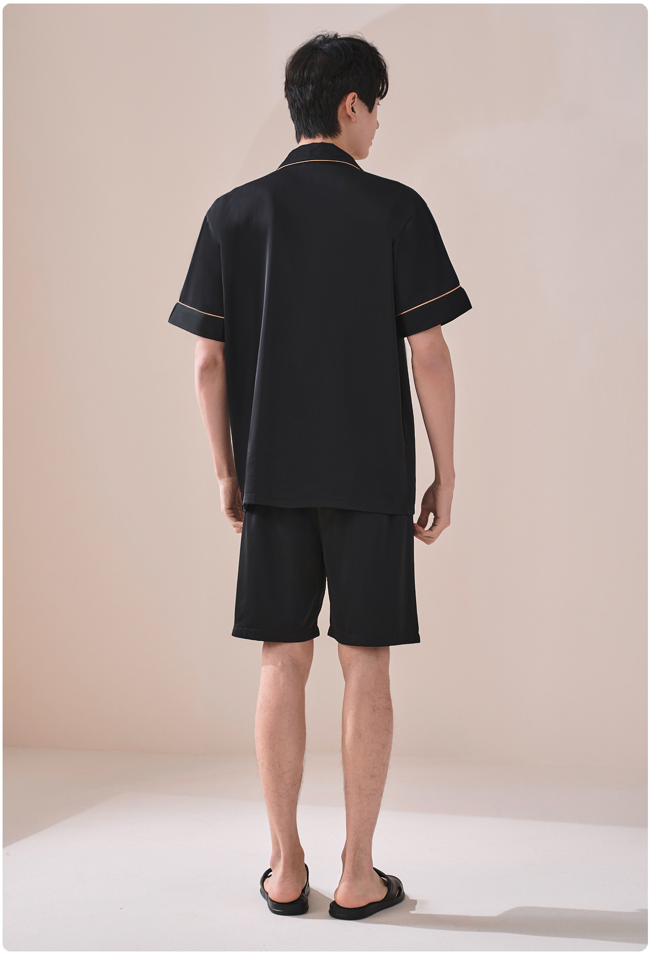 2023 잠옷 남자의 여름 반팔 반바지 아이스 실크 고급 봄과 여름 실크 가정 옷 블랙 세트