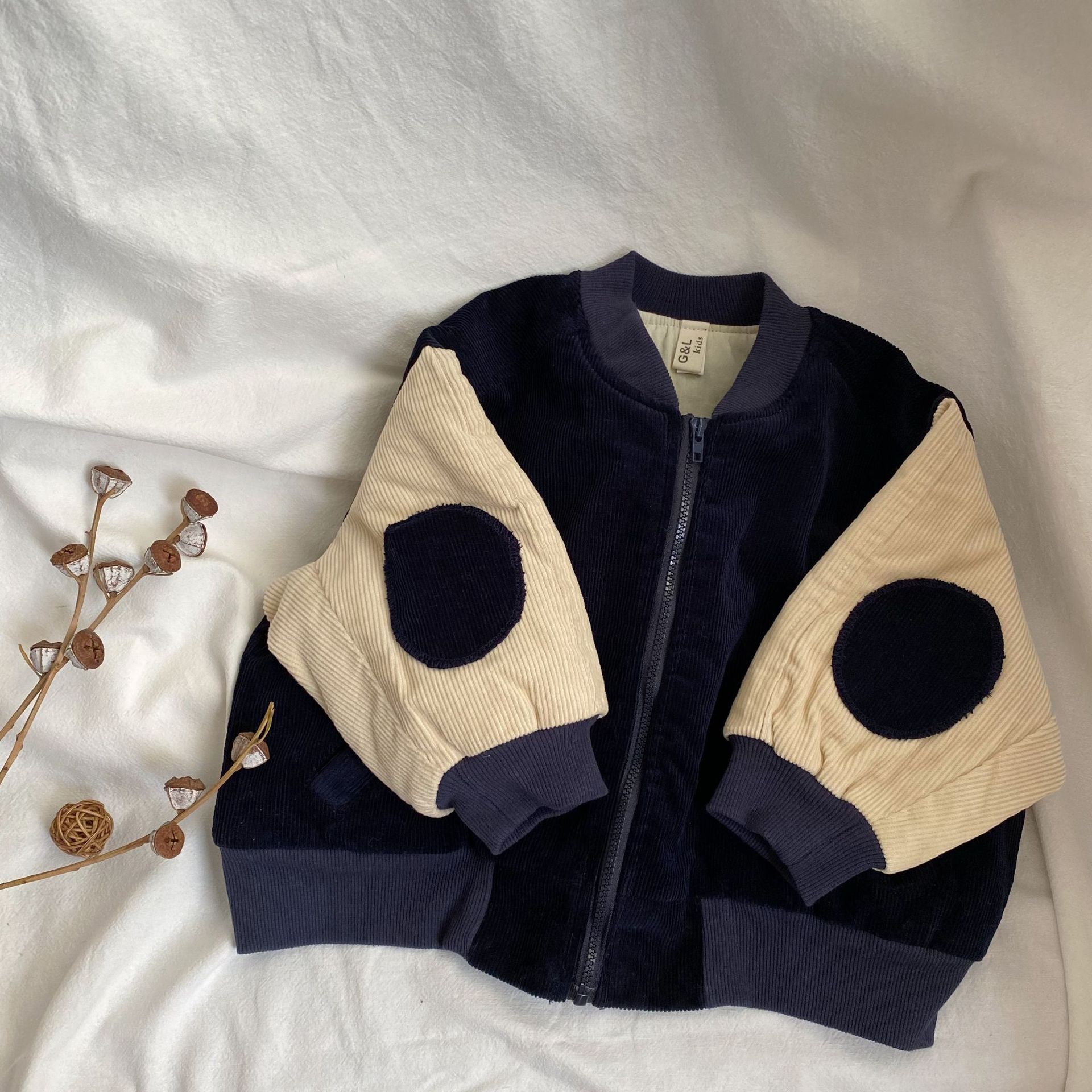 GL-kids 한국 가을과 겨울 어린이 코듀로이 코튼 자켓 소년 소녀 라운드 패치 느슨한 두꺼운 탑