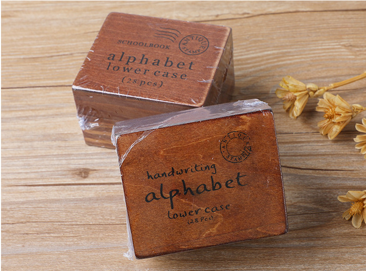 28개의 나무로 된 대문자 및 소문자 스탬프 세트, 나무 상자 포장, DIY 다이어리용, 일반체 및 필기체, 도매, 레트로 스타일스토어 가기