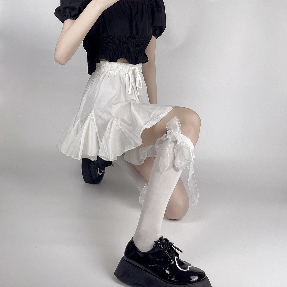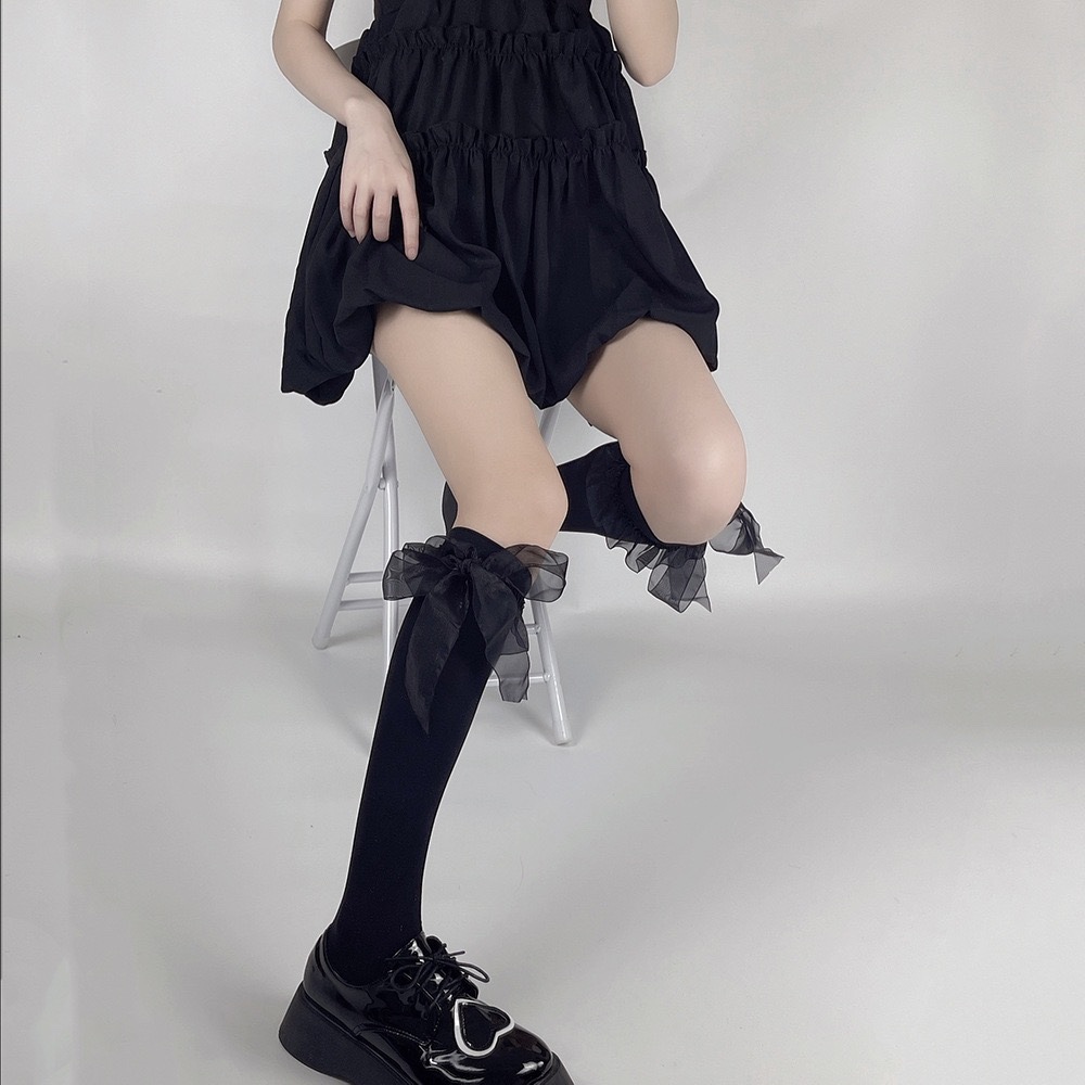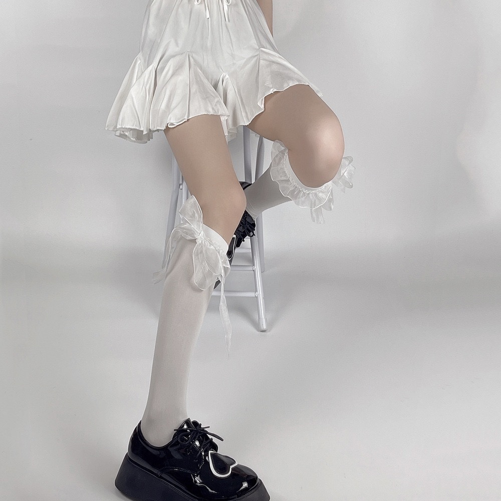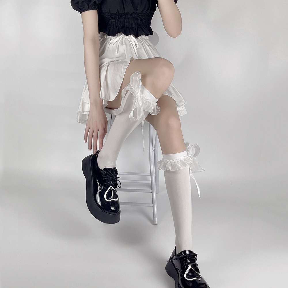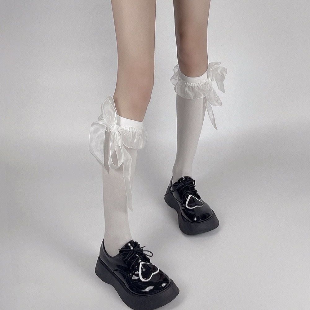 로리타 벨벳 중공업 새틴 레이스 리본 보우 커프 양말 달콤한 JK 소녀 귀여운 미드 튜브 양말