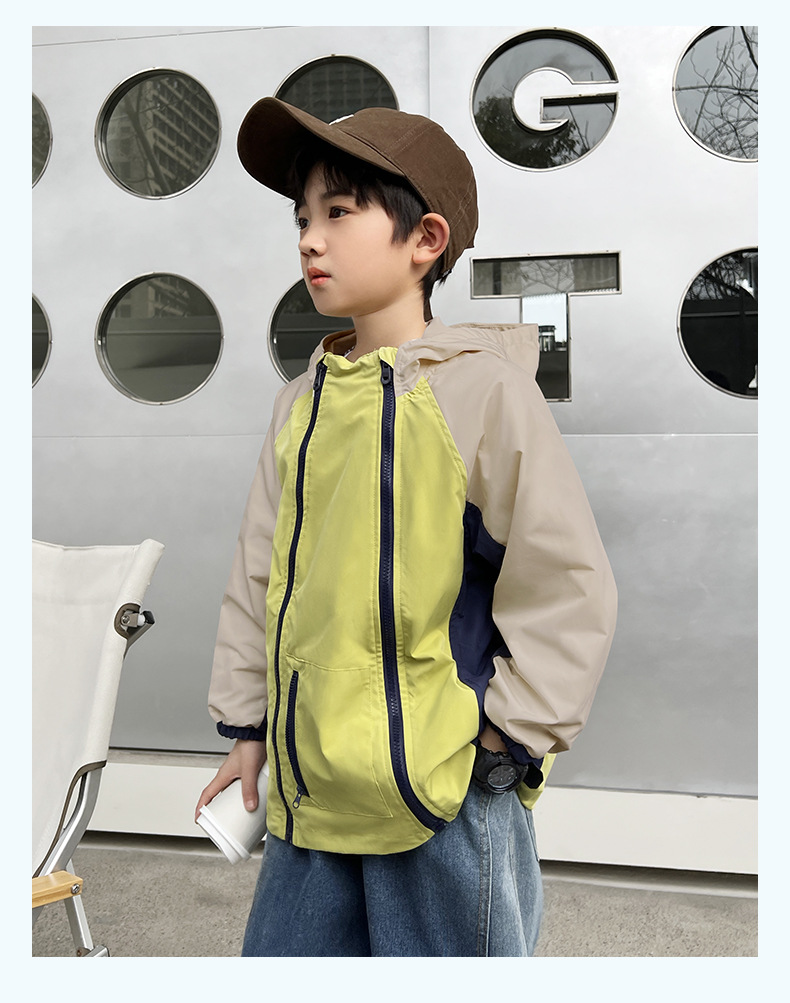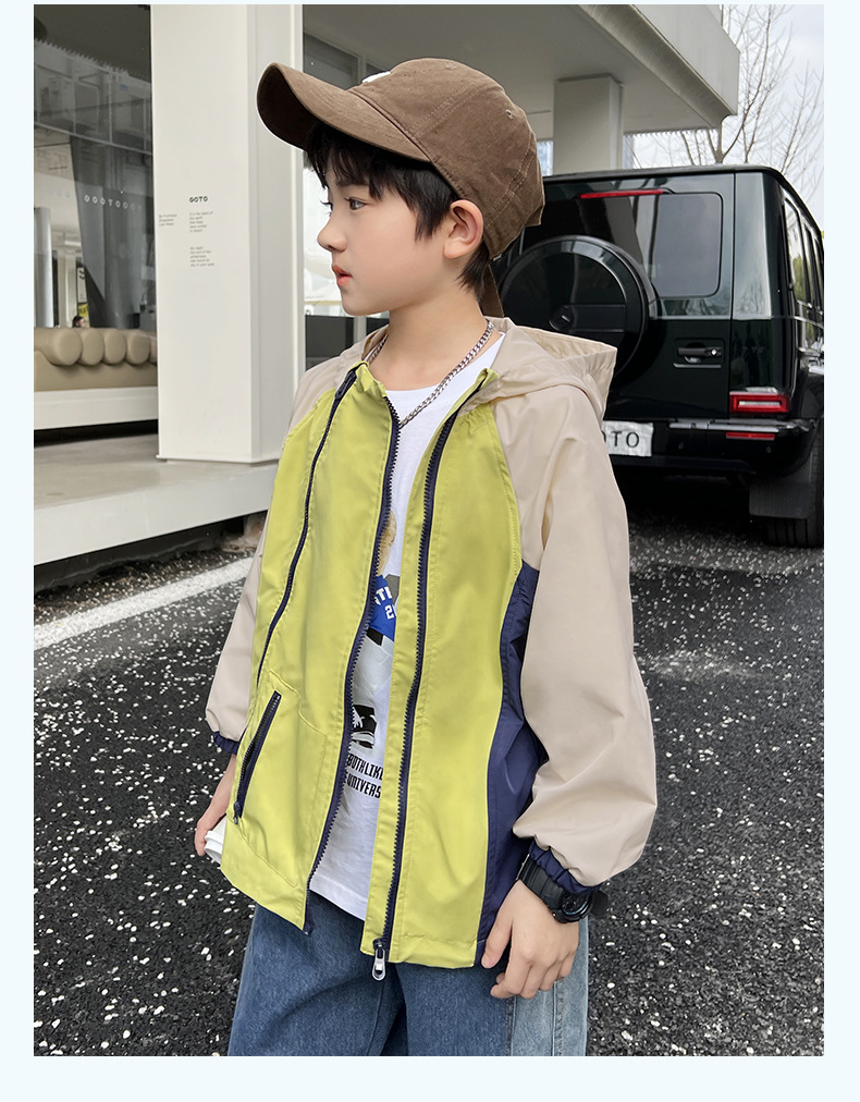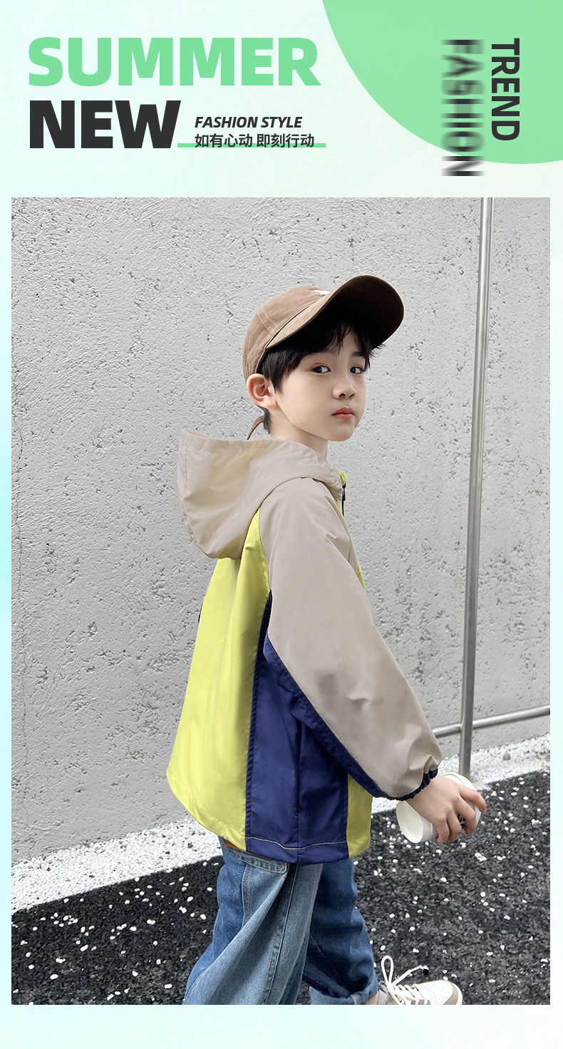 2024년 여름 신상 아동용 캐주얼 콘트라스트 컬러 후드 남아용 얇은 바람막이 중대형 아동복 유행 도매스토어 가기