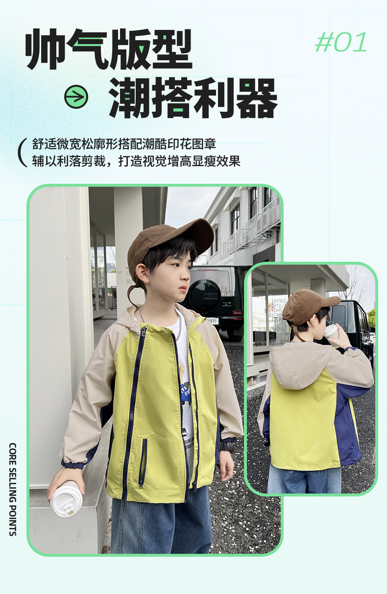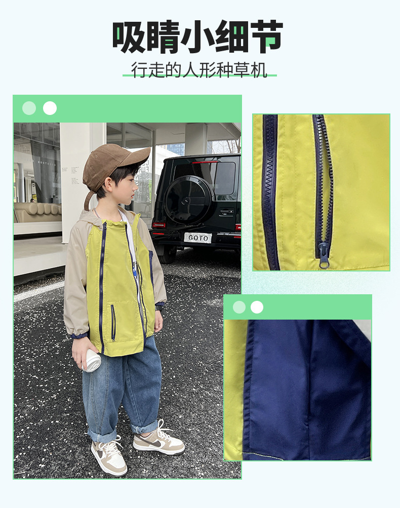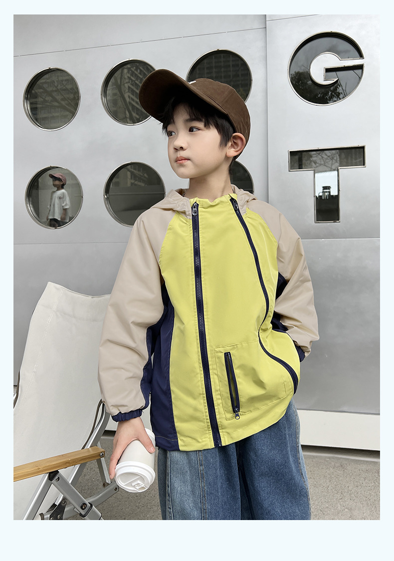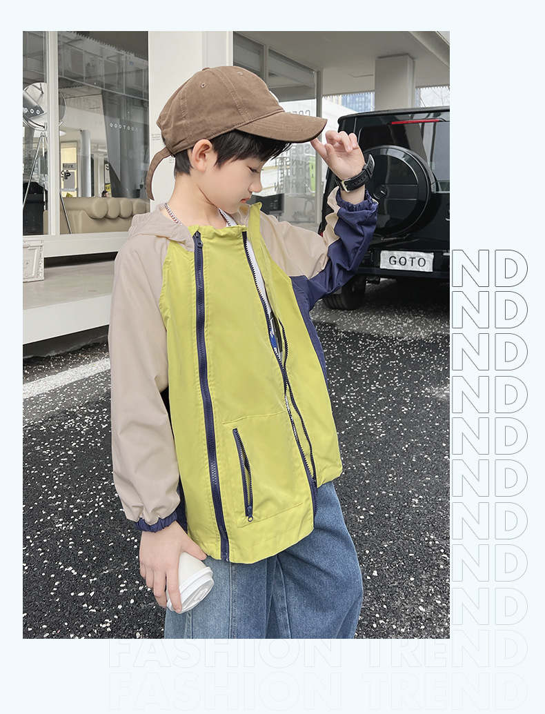 2024년 여름 신상 아동용 캐주얼 콘트라스트 컬러 후드 남아용 얇은 바람막이 중대형 아동복 유행 도매스토어 가기