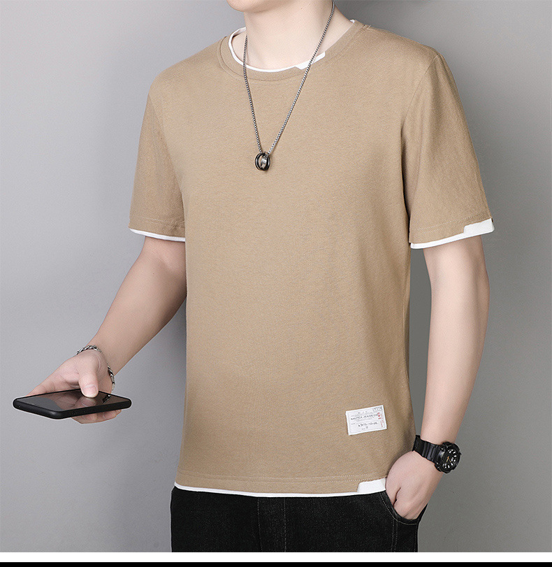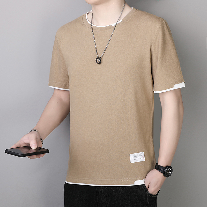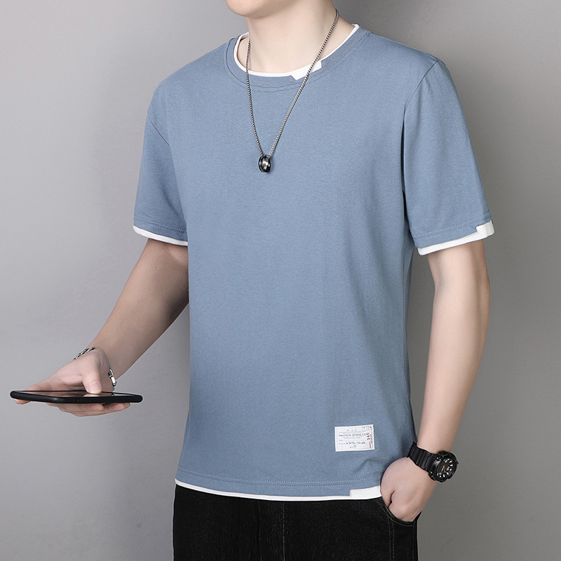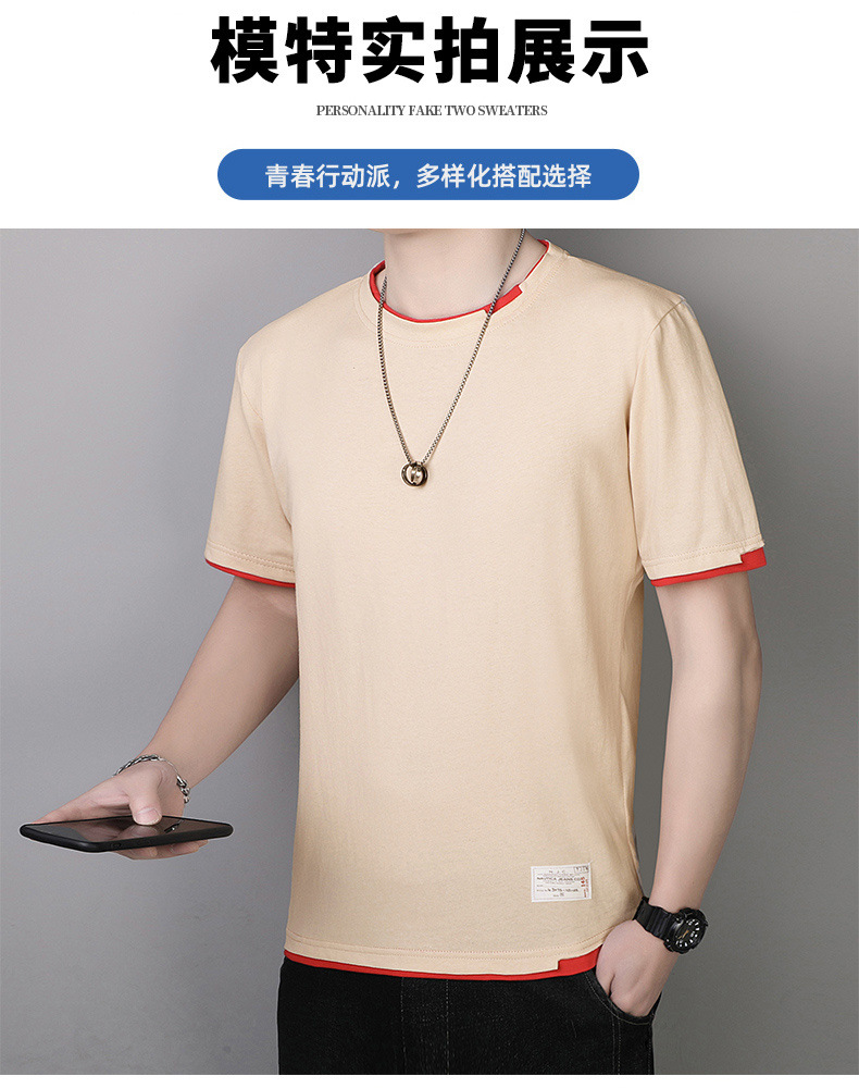 면 반팔 티셔츠 남성용 여름 트렌디 한 느슨한 가짜 투피스 하프 슬리브 베이스 셔츠 청소년 패션 모든 매치 탑