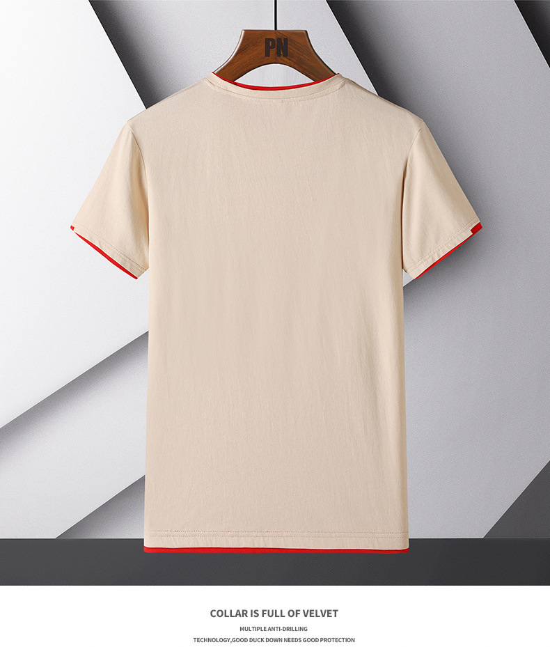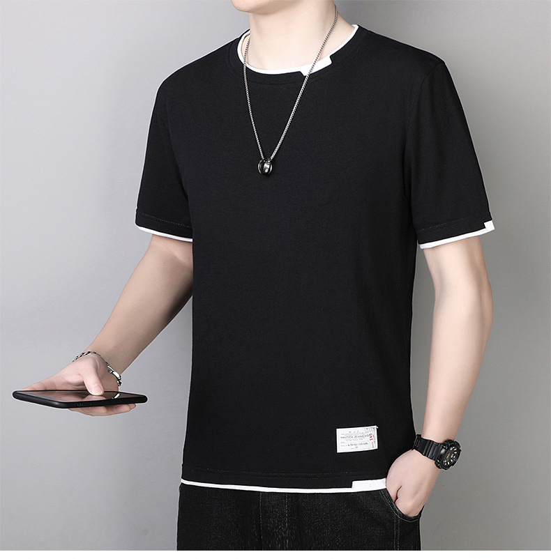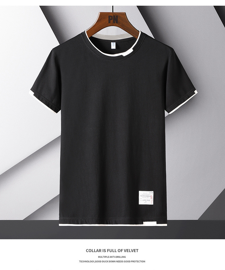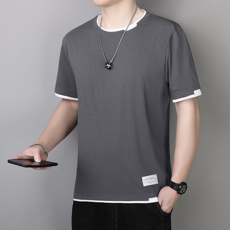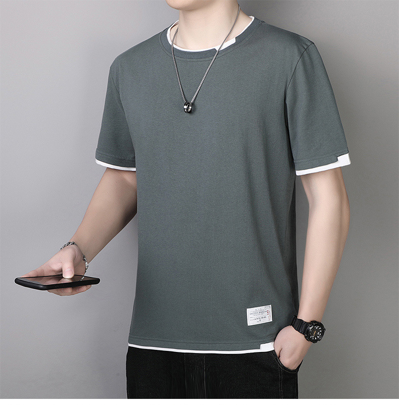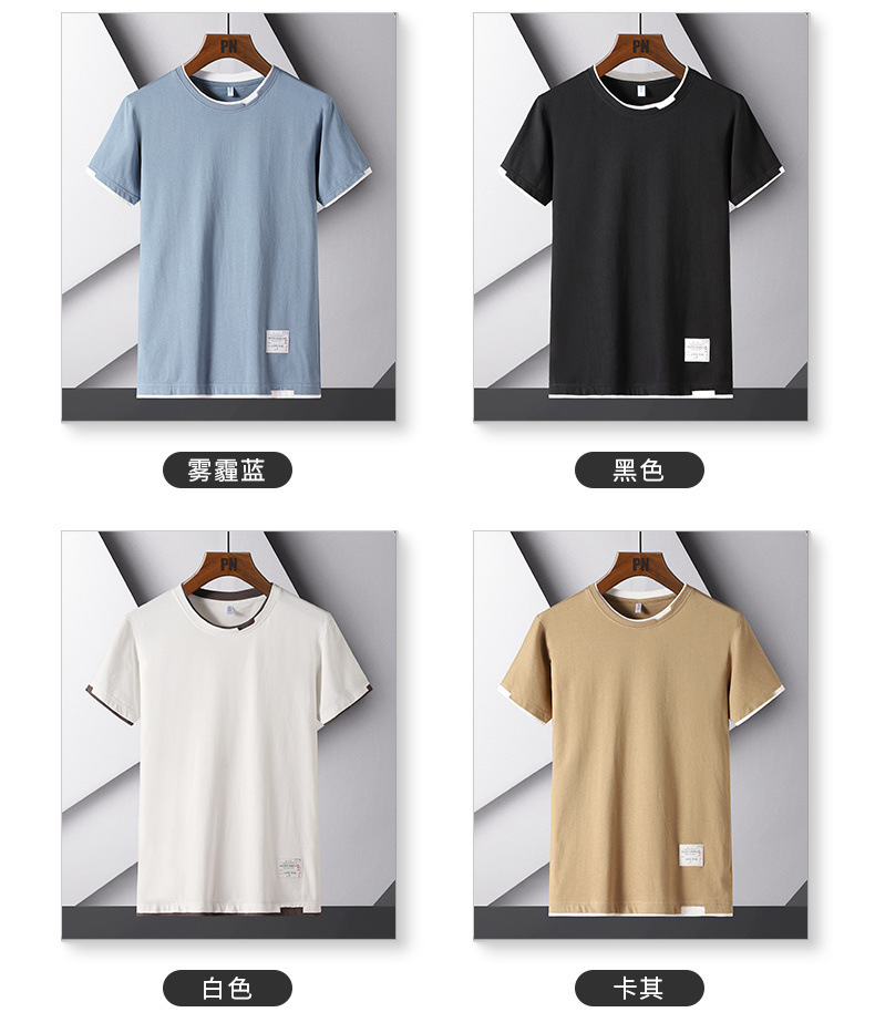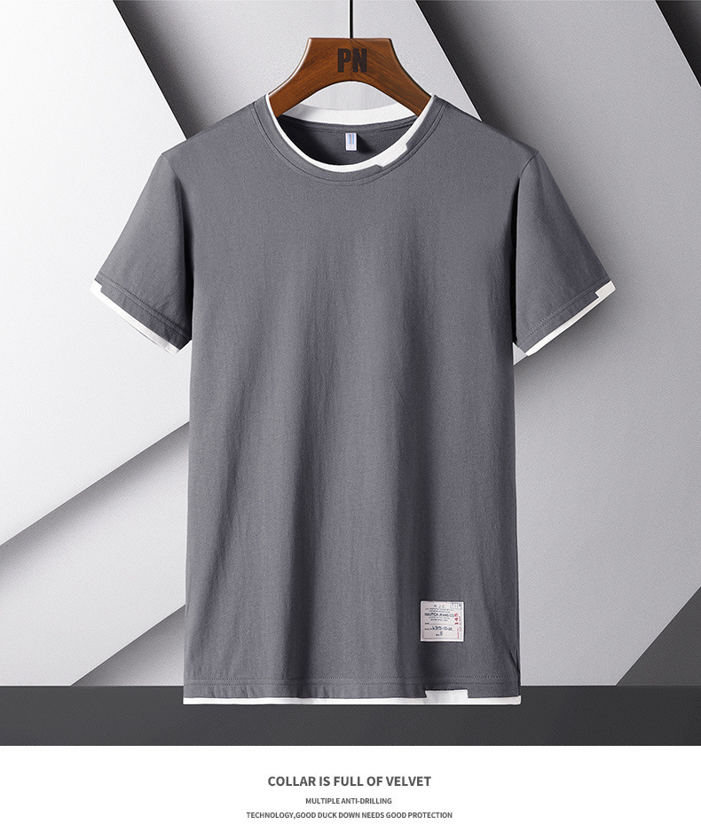 면 반팔 티셔츠 남성용 여름 트렌디 한 느슨한 가짜 투피스 하프 슬리브 베이스 셔츠 청소년 패션 모든 매치 탑스토어 가기