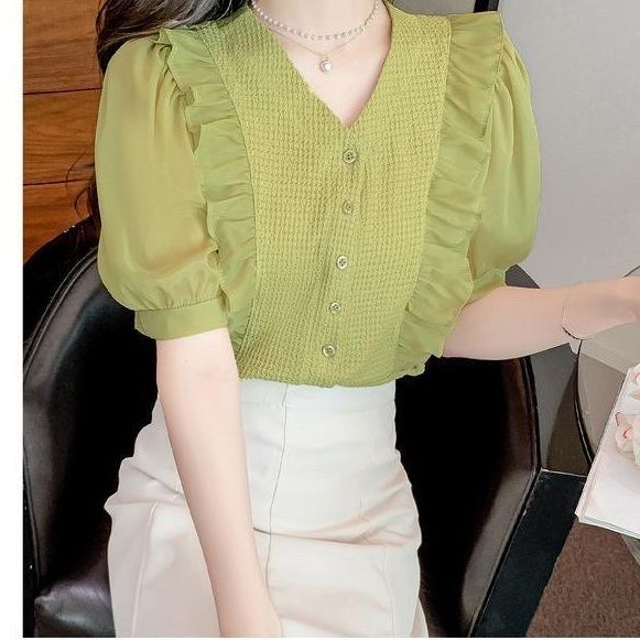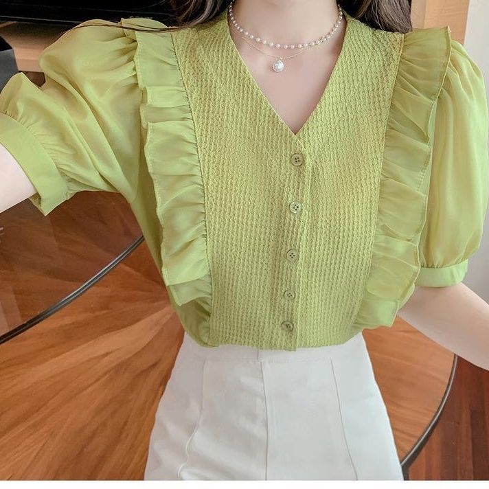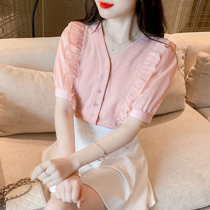 2023 여름 새로운 달콤한 신선한 쉬폰 셔츠 반 소매 V 넥 신선한 달콤한 느슨한 가디건 여성스토어 가기