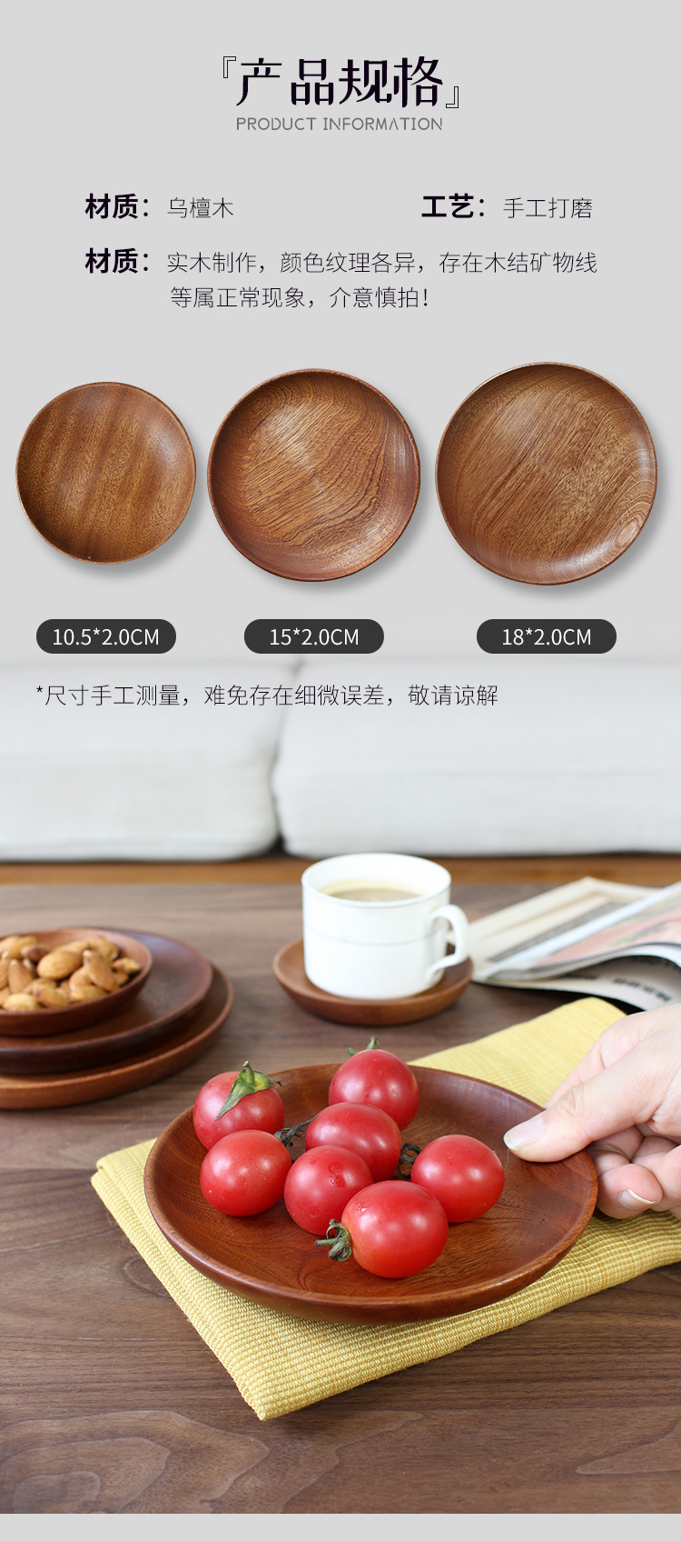 단단한 나무 식기 접시 접시 검정 백단향 트레이 디스크 작은 접시 나무 말린 과일 멜론 씨 접시 장식품 소품스토어 가기