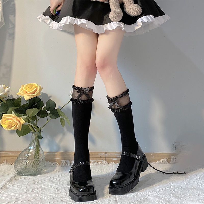 Jk 송아지 양말 로리타 레이스 중간 길이 양말 여성용 여름 얇은 활 로리타 귀여운 반 양말 슬리밍