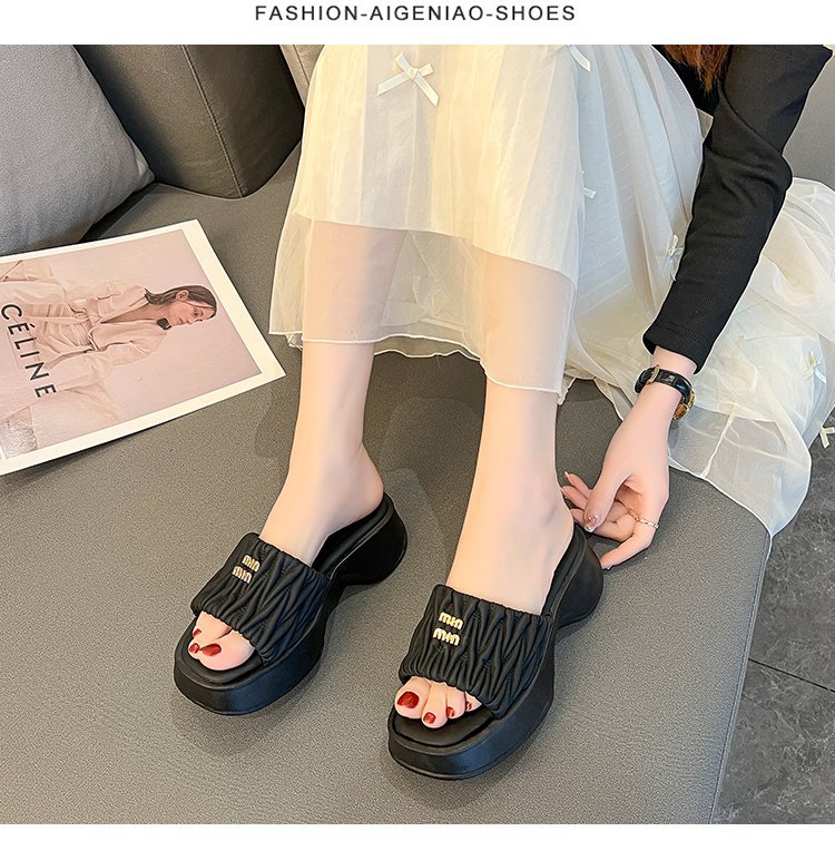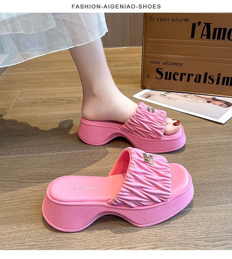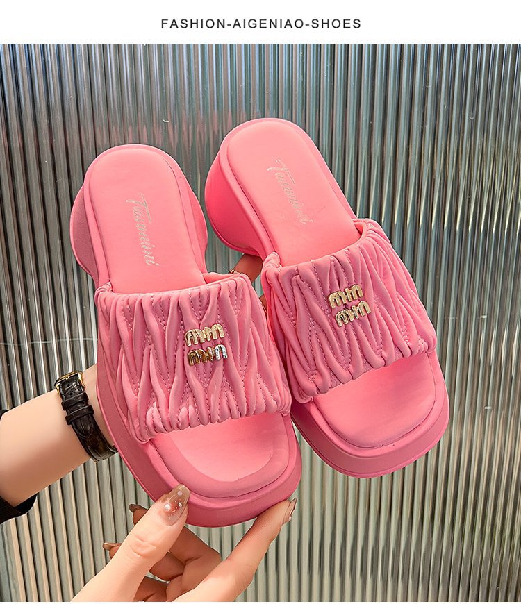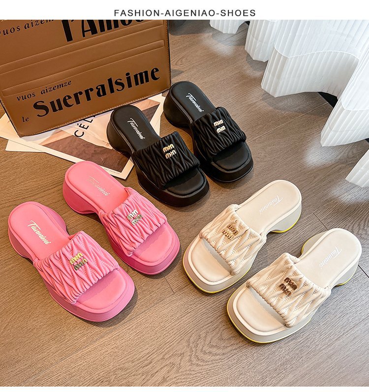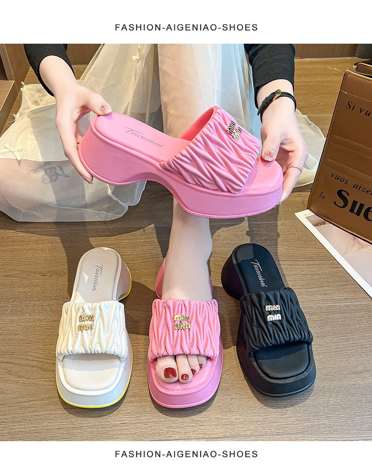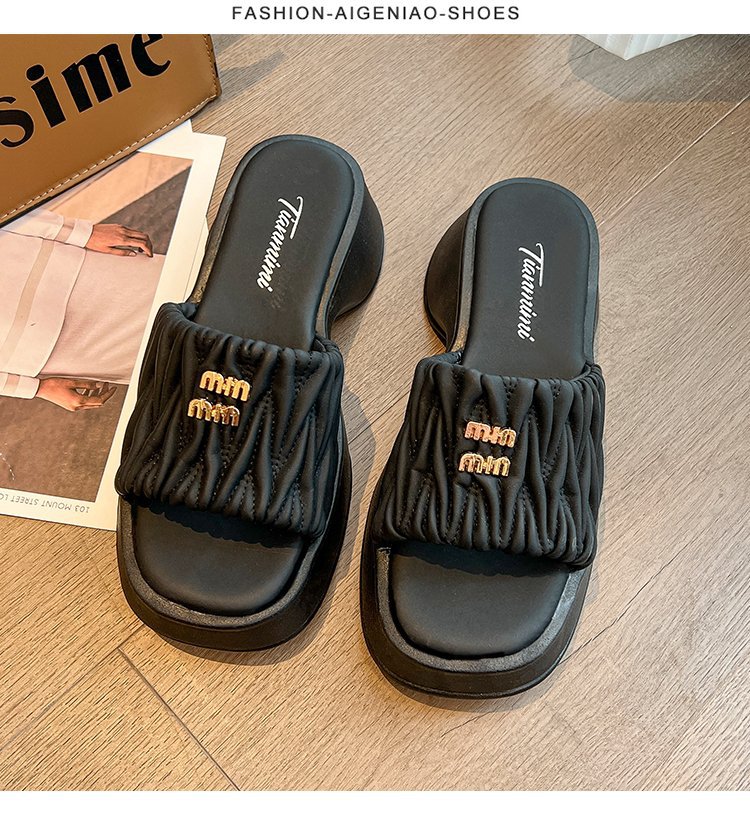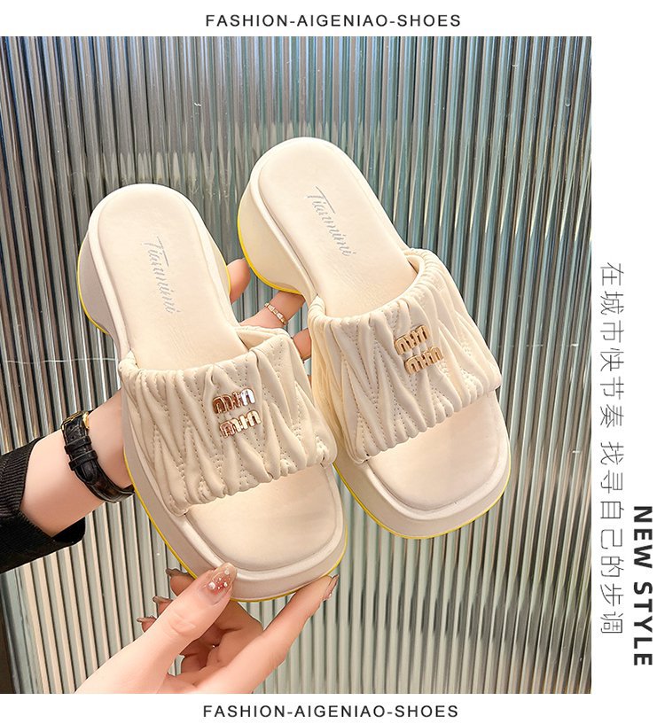 여성용 플리츠 클라우드 샌들 슬리퍼, 캐주얼하고 패셔너블한 스퀘어 토 웨지힐 슬리퍼, 2024 여름 아우터용 슬립온 슬리퍼스토어 가기