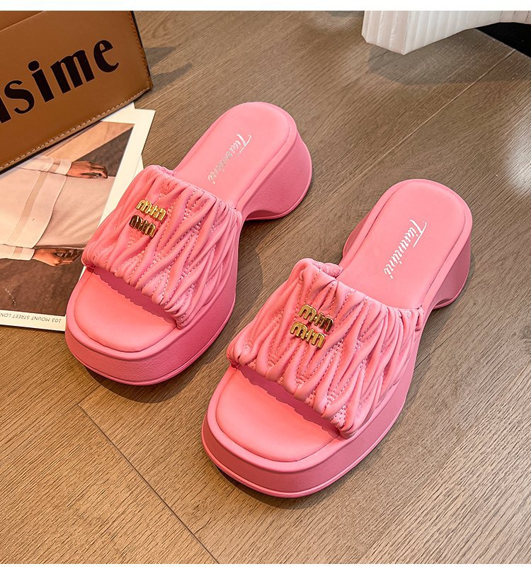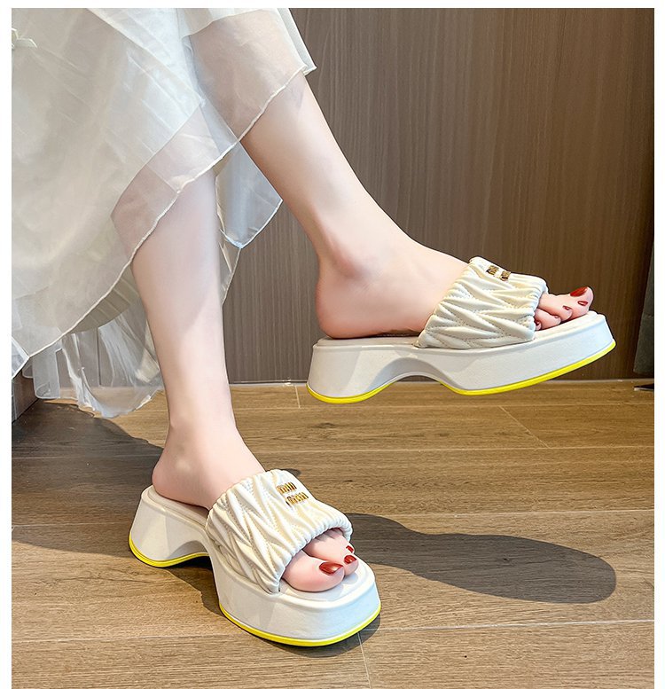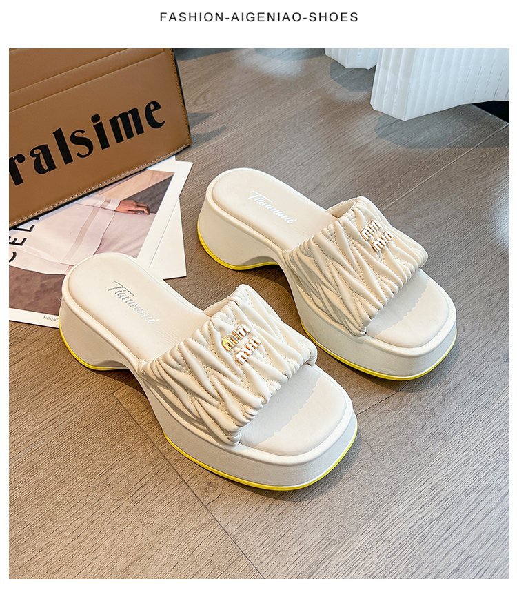 여성용 플리츠 클라우드 샌들 슬리퍼, 캐주얼하고 패셔너블한 스퀘어 토 웨지힐 슬리퍼, 2024 여름 아우터용 슬립온 슬리퍼