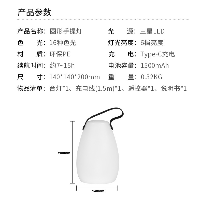 • [원형 휴대용 램프] 태양광 충전 + USB-C 충전 + 리모컨