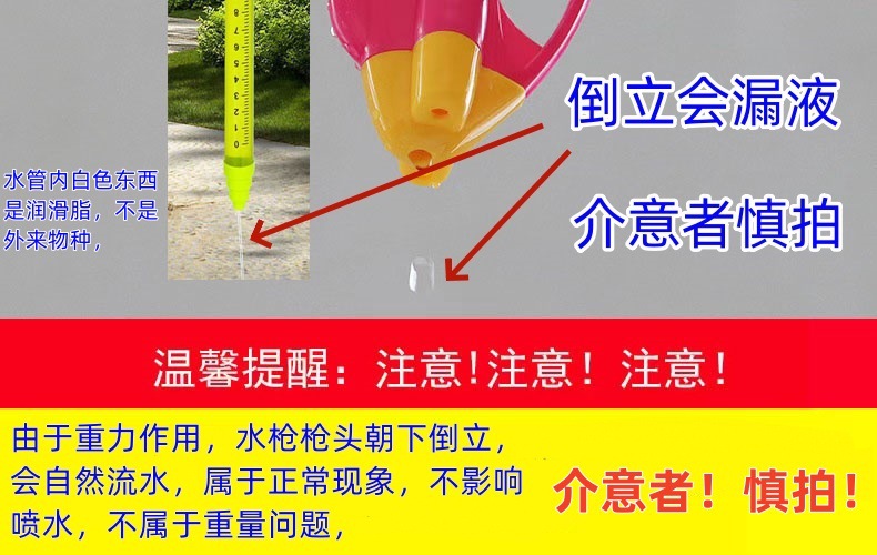 由于压力和惯性,水抽顶部有的还会设计一个进气孔,平放或是倒立都会漏水,这个不属于质量问题,不影响喷水效果的,有的塑料盖之间的缝隙也可能比较大,这个也不影响射水效果,如果介意的勿拍,小本生意都不容易,水枪玩具的自身缺陷已告知您,如果因漏水或是缝隙比较大,颜色款式等问题的退货,需要您支付快递费用的