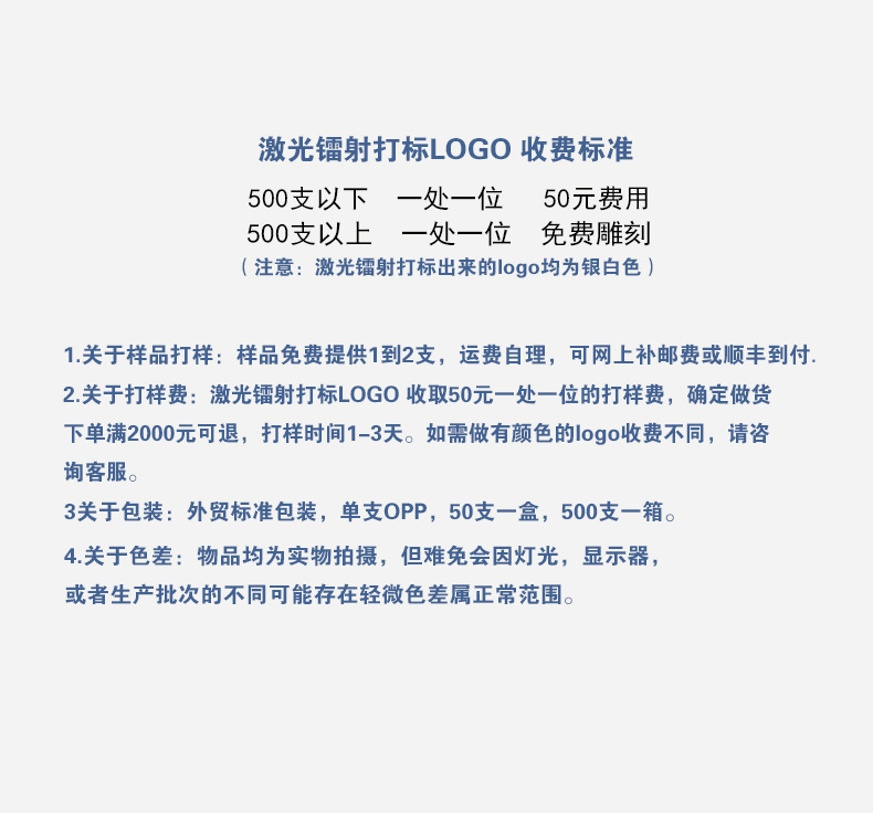 4、关于色差 色差是任何一个网络卖家无法避免的问题,色差产生原因很多,如不同相机,不同显示器,不同光线和环境,色差无处不在,毕竟机器不是人的眼睛,我们会尽量减少实物和图片的色差,色差不能做为中,差评或者退换货的理由。如对产品颜色特别介意的朋友请谨慎考虑后再拍。