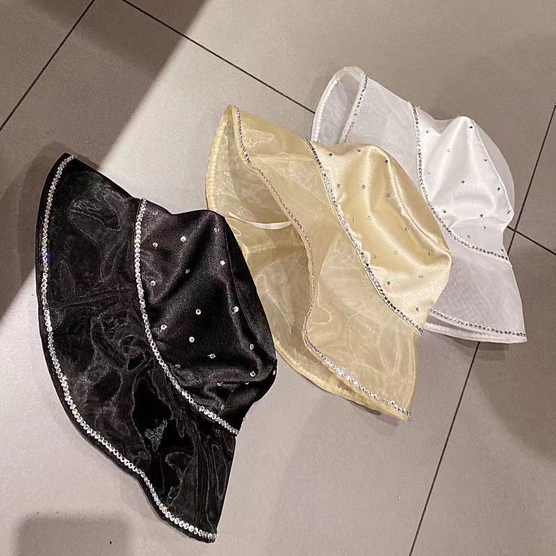 봄과 여름 2023 새로운 스타일 샤넬 스타일 진주 모자 여성용 여름 새틴 메쉬 어부 모자 우아한 큰 챙 태양 모자
