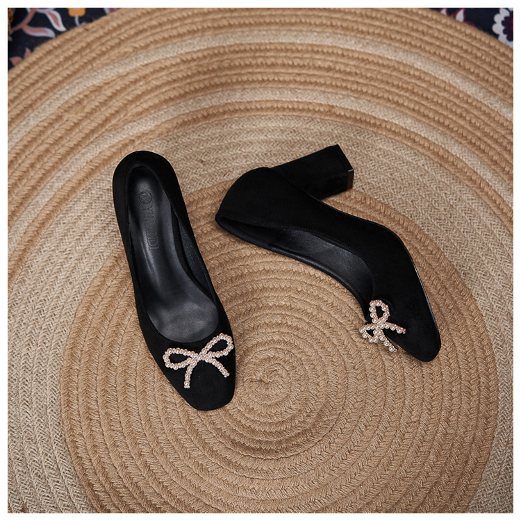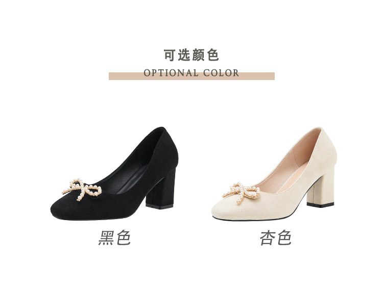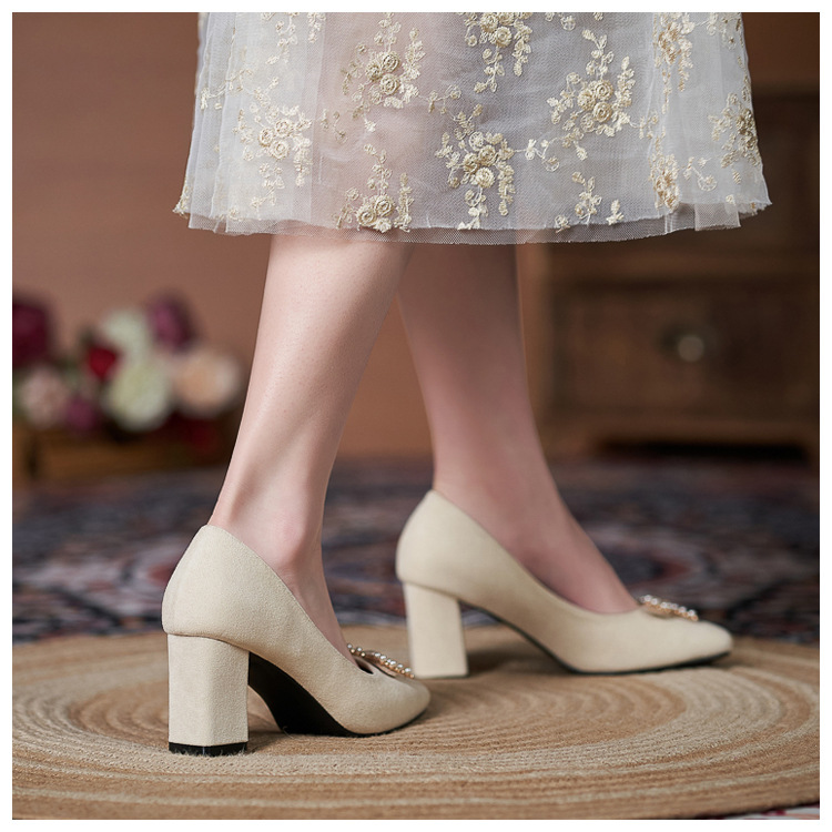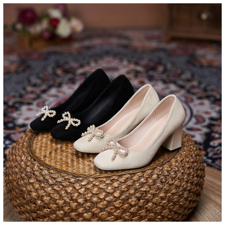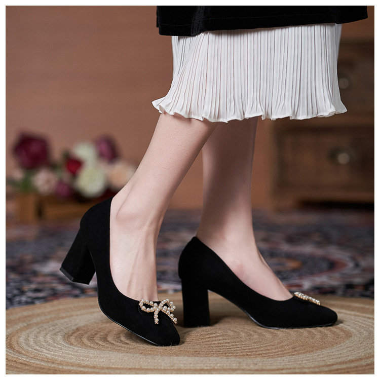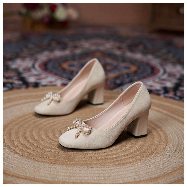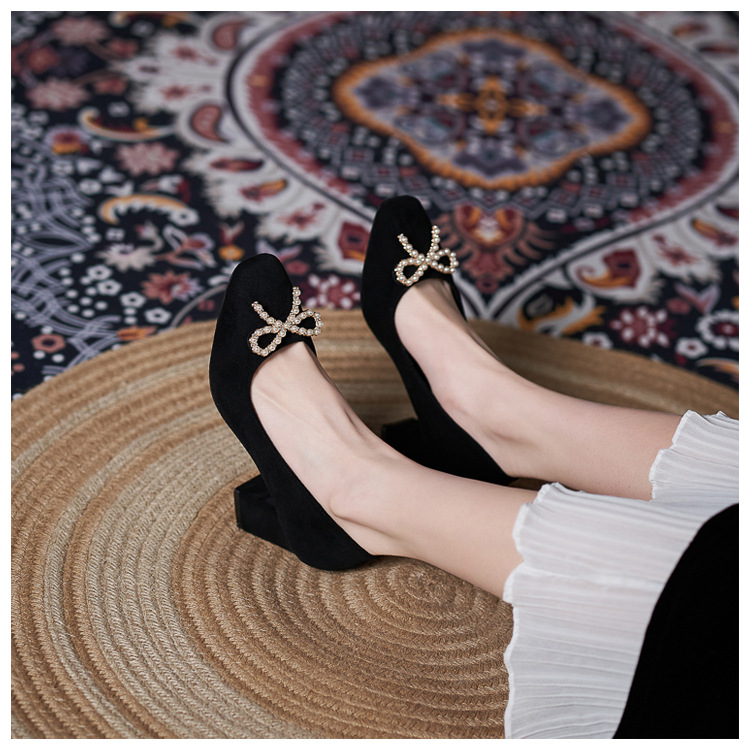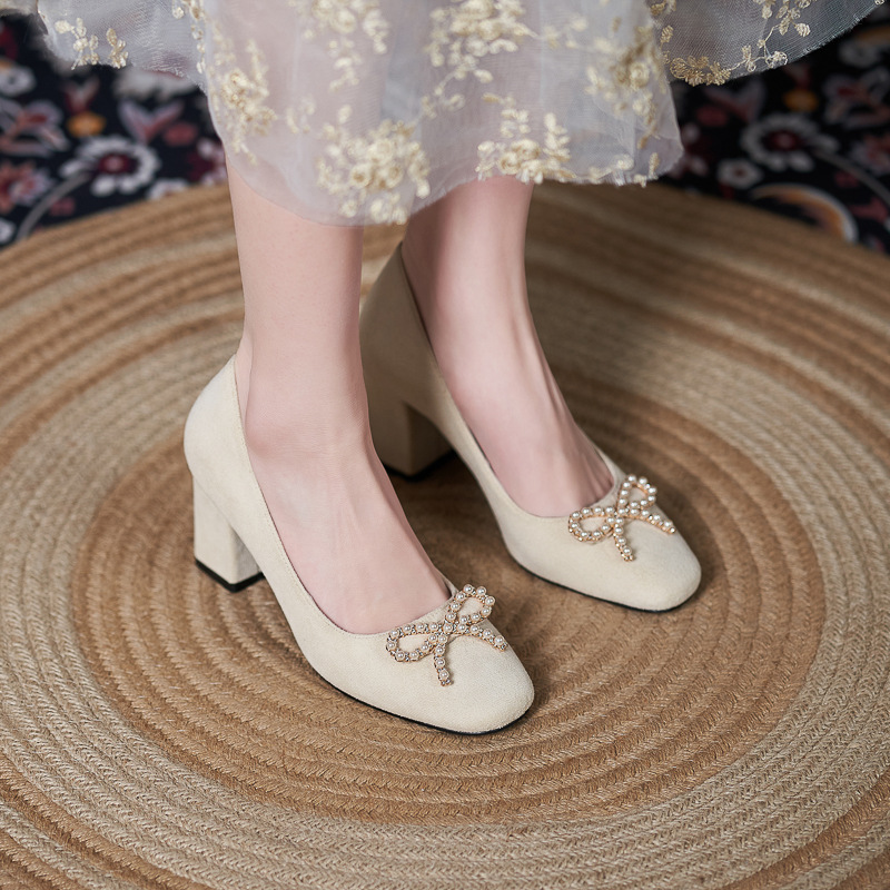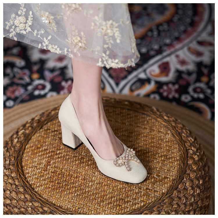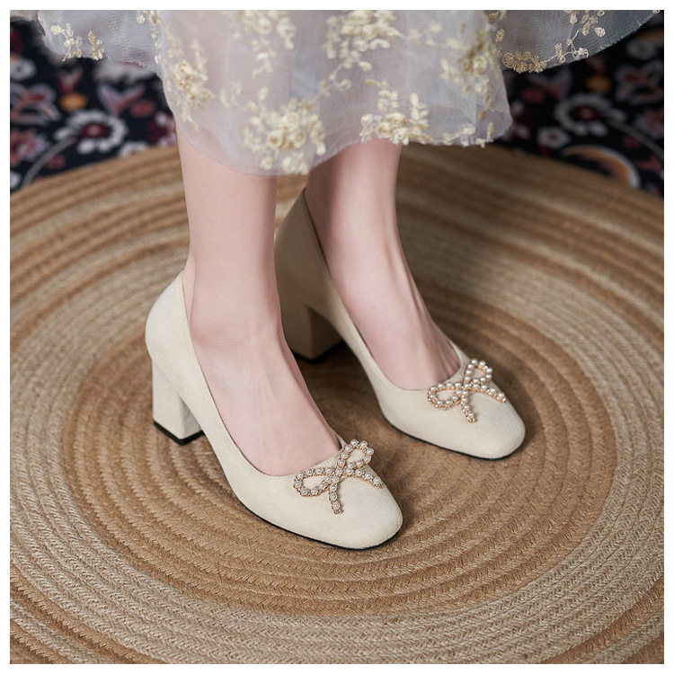2023 새로운 두꺼운 굽 하이힐 활 여성용 플러스 사이즈 스퀘어 토 여성용 신발 스몰 사이즈 얕은 진주 스퀘어 버클스토어 가기
