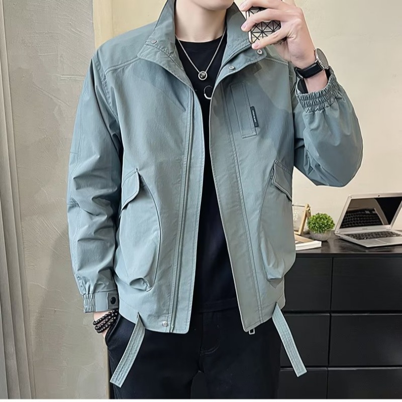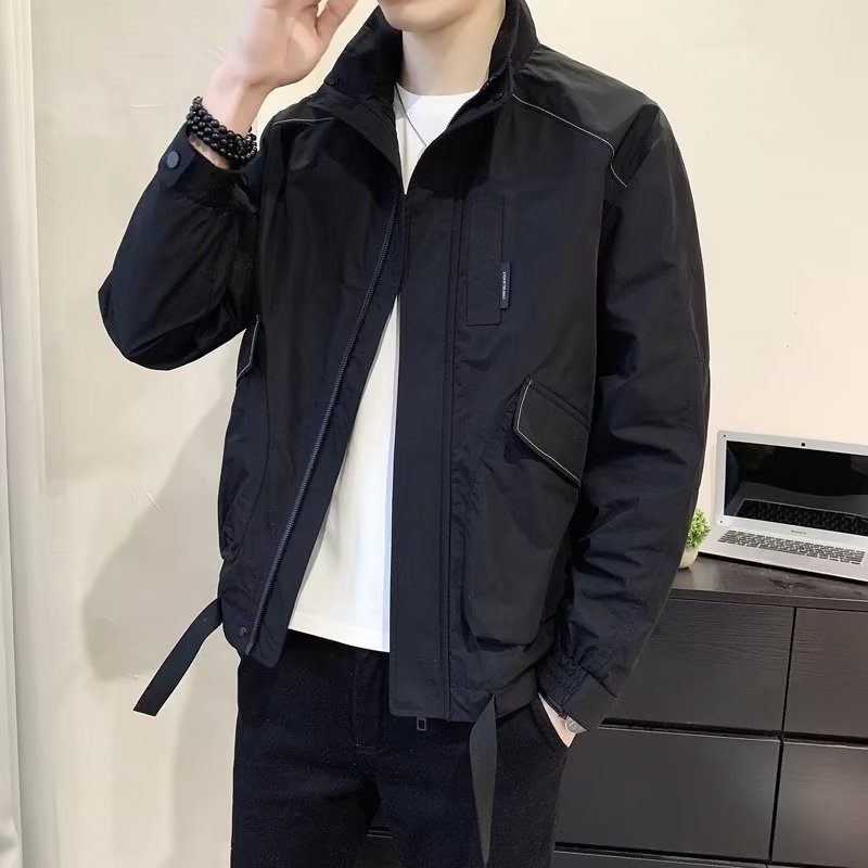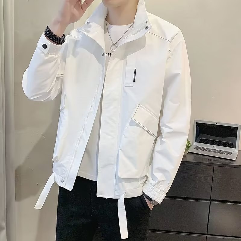 새로운 화이트 재킷 남성 봄과 가을 느슨한 세로 칼라 얇은 지퍼 작업복 재킷 캐주얼 남성 패션 브랜드 가을 옷스토어 가기