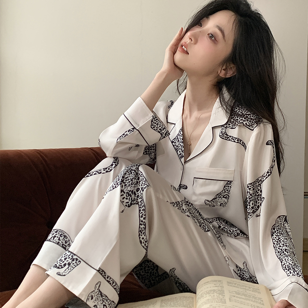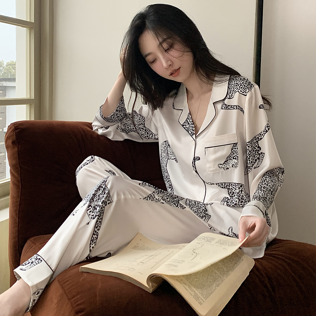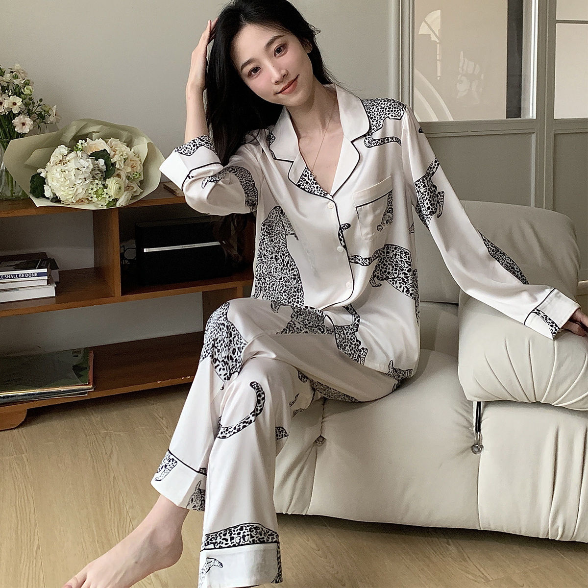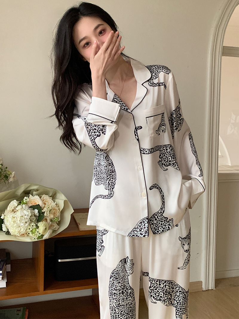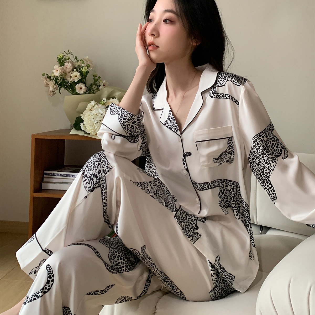 2023 새로운 숙녀 얼음 실크 잠옷 세트 긴 소매 바지 표범 편안한 가정 옷 통기성 봄과 가을