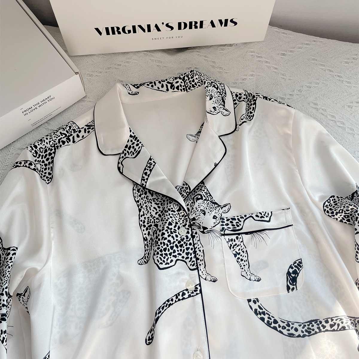 2023 새로운 숙녀 얼음 실크 잠옷 세트 긴 소매 바지 표범 편안한 가정 옷 통기성 봄과 가을스토어 가기