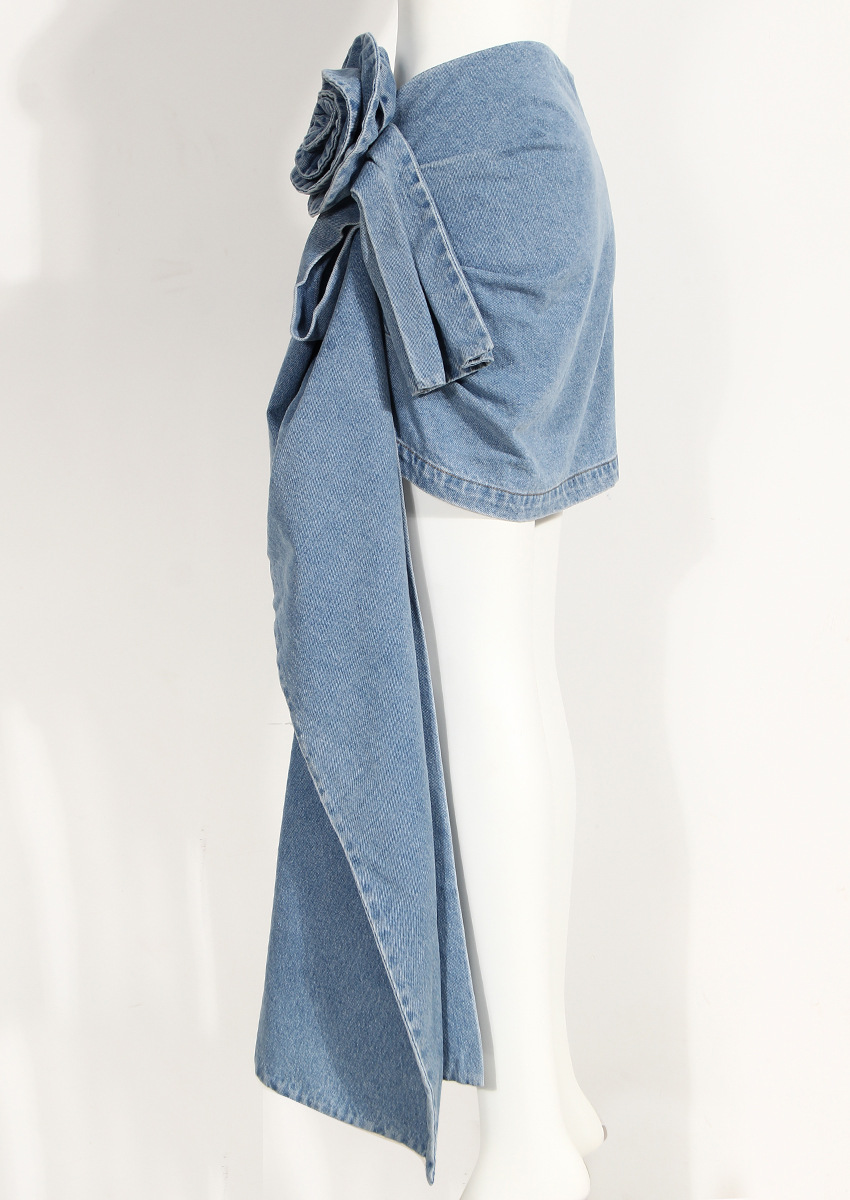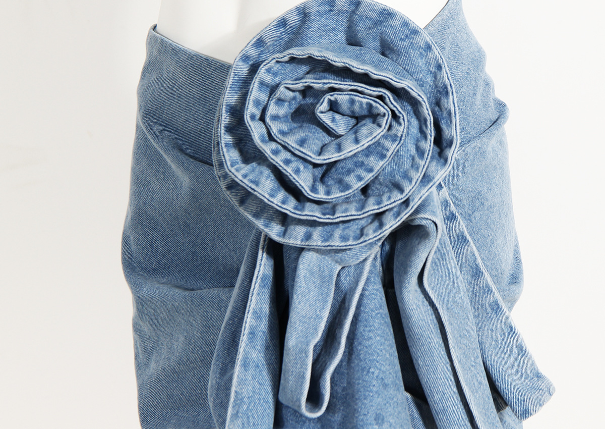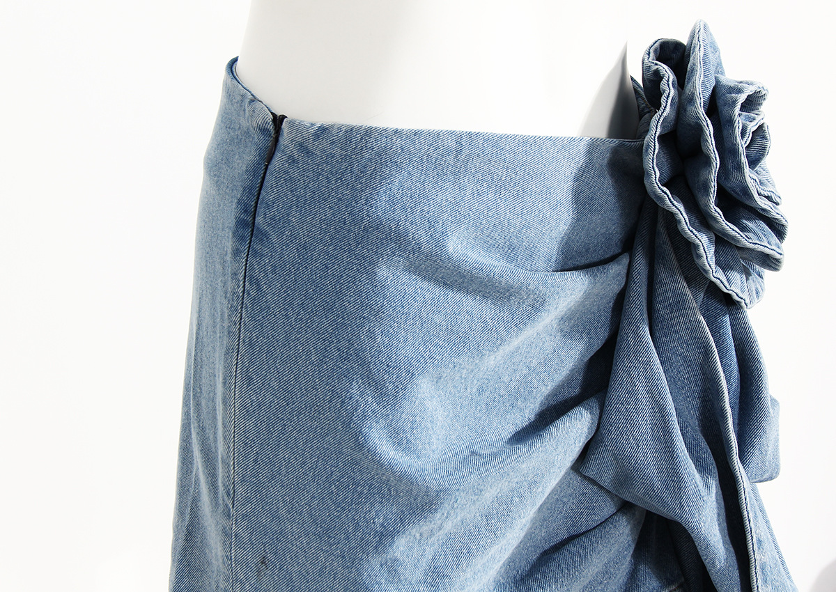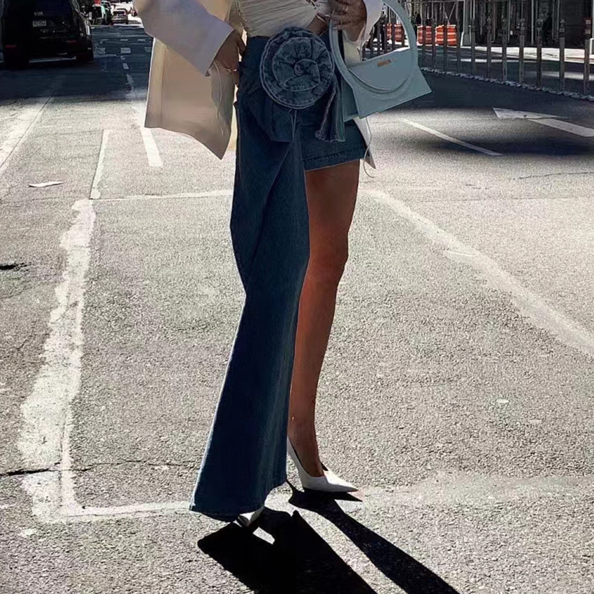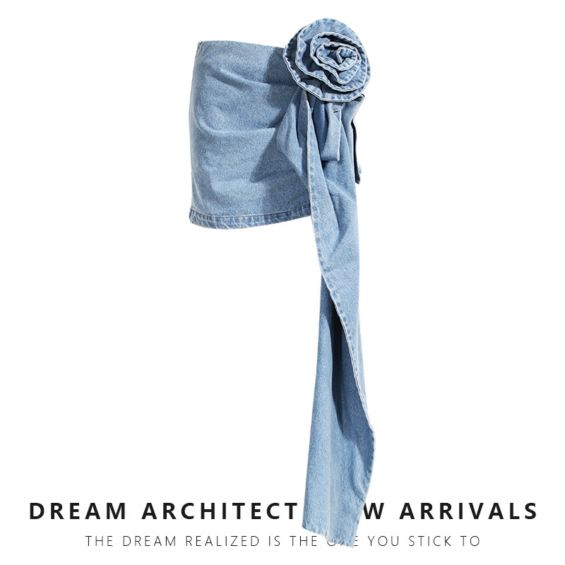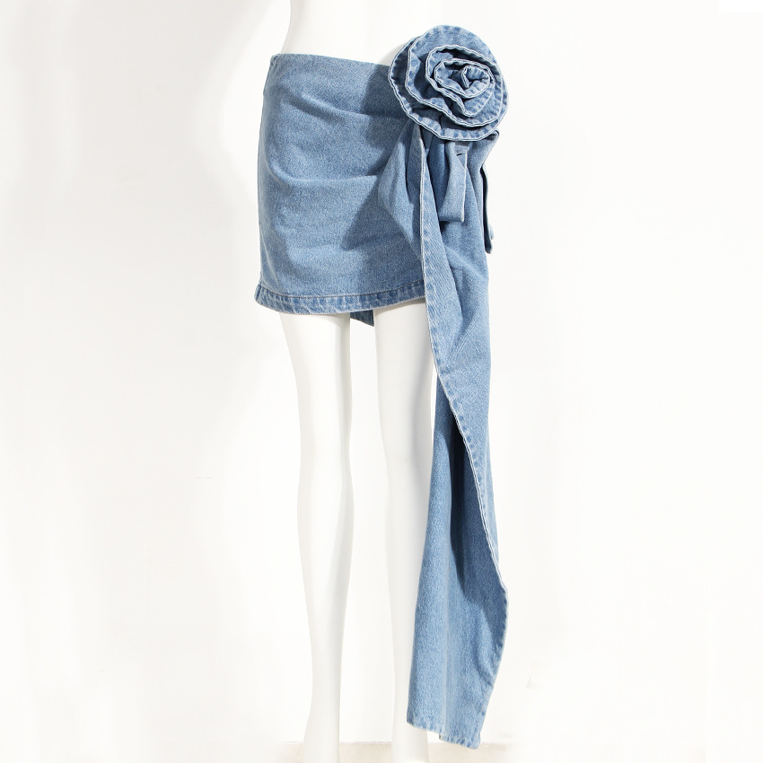25 봄 여름 신상 데님 숏 스커트 3D 입체 장미 드레이프 롱 패치 하이웨이스트 힙 커버 미니 데님 스커트