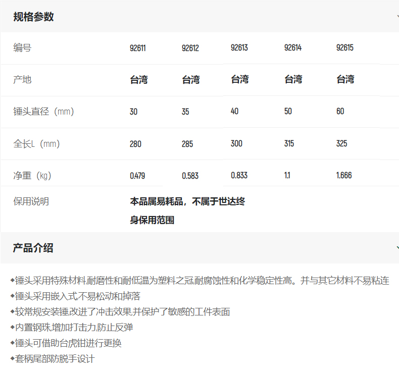 • 92615 (해머 헤드 직경 60MM, 길이 325MM, 무게 1666G)