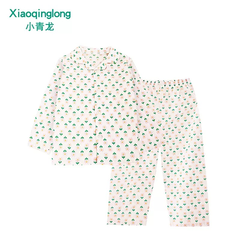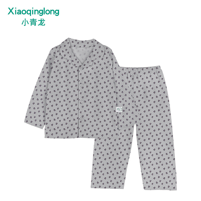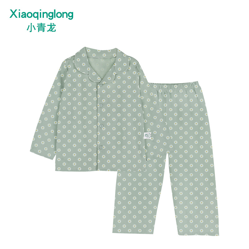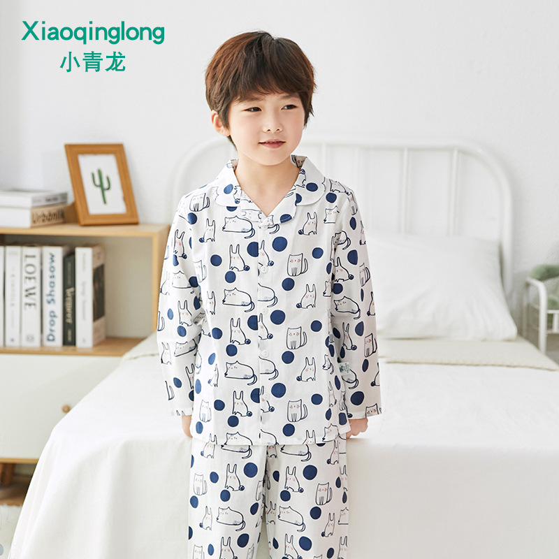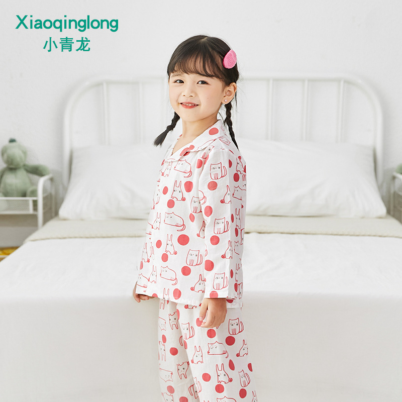 리틀 칭롱 봄 새로운 소년과 소녀 중 큰 아이 캐주얼 풀 코튼 얇은 옷깃 홈 잠옷 세트