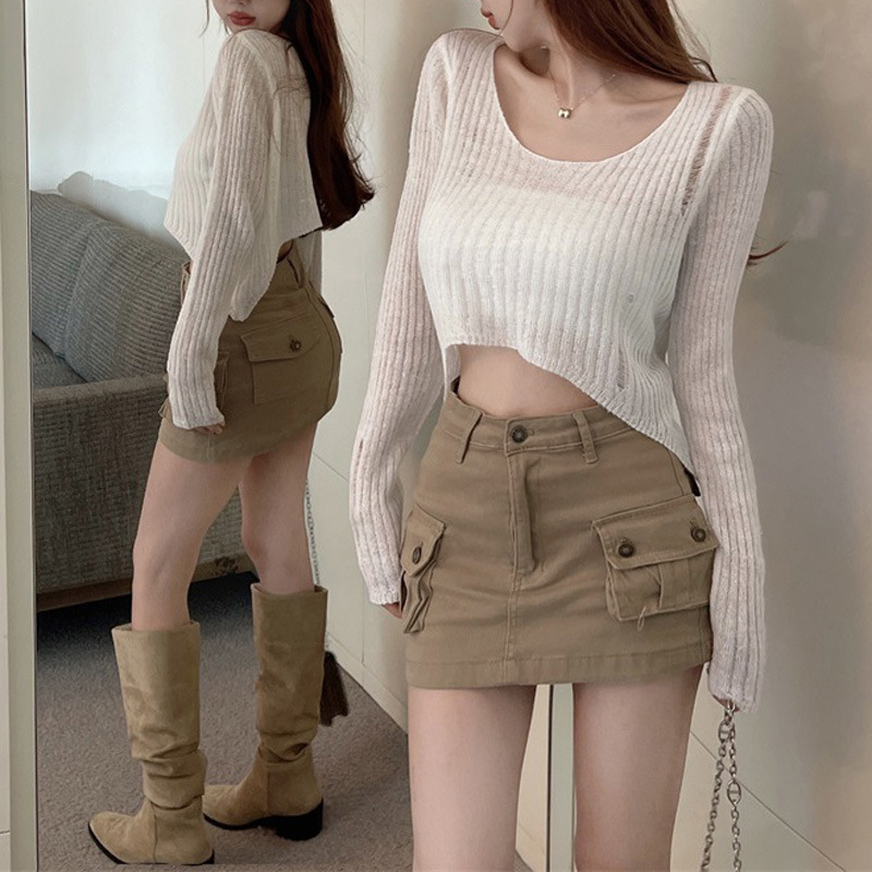 2025 봄과 여름 새로운 여성 핫 소녀 배꼽 노출 스웨터 디자인 기본 블라우스 중공 긴팔 탑 여성을위한스토어 가기