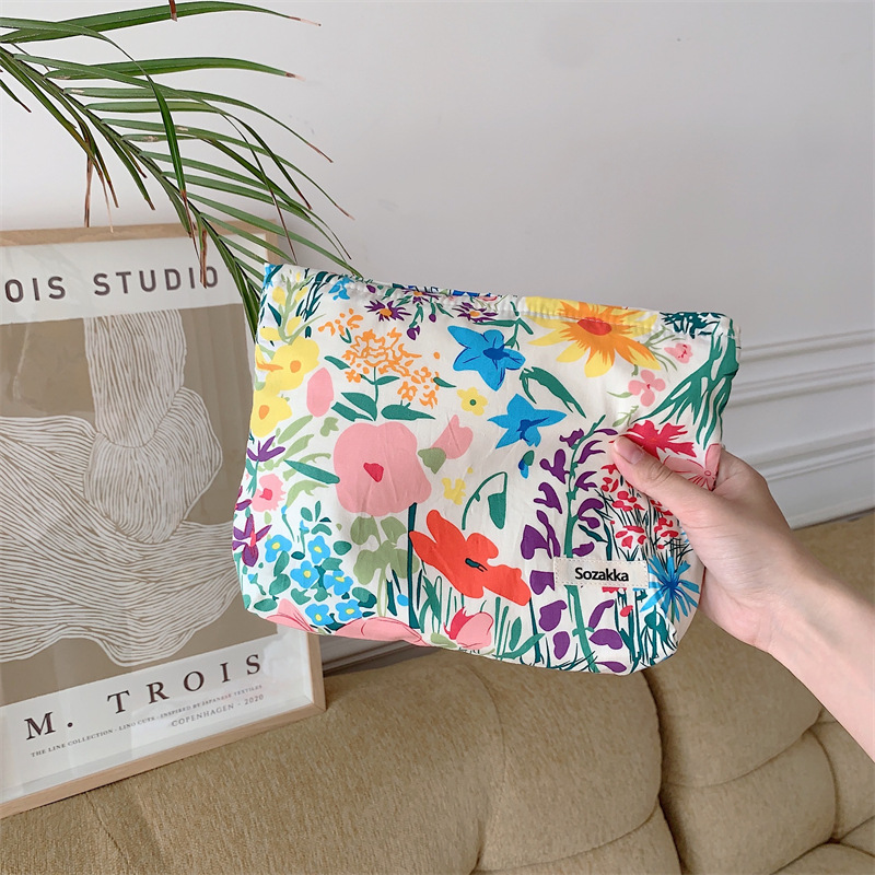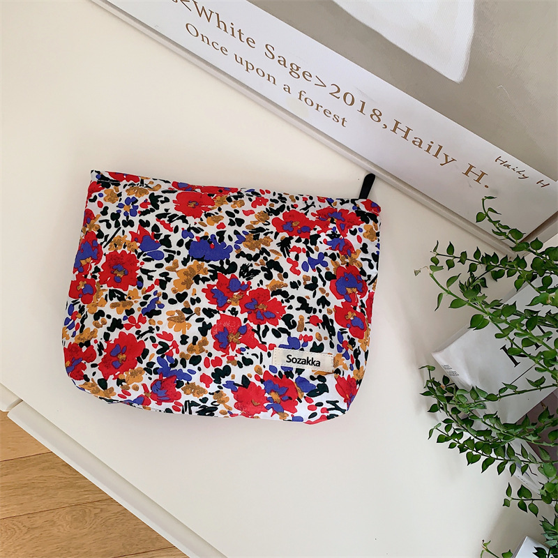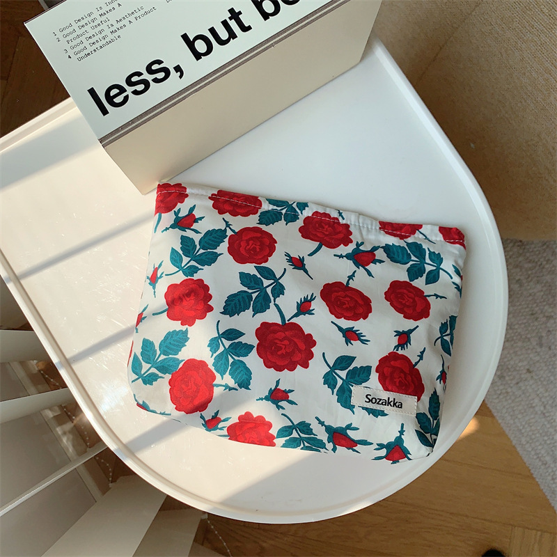 3432 예술적 신선한 꽃 면 화장품 가방 일본 클러치 백 휴대용 잡화 보관 가방 빨간 가방스토어 가기