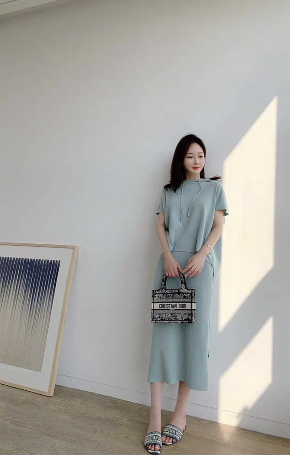 재고 한국 세련된 우아한 세트 여자의 여름 새로운 후드 탑 스플릿 하프 스커트 니트 투피스 세트스토어 가기