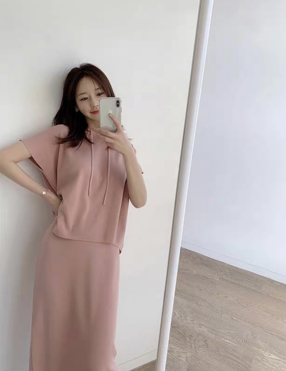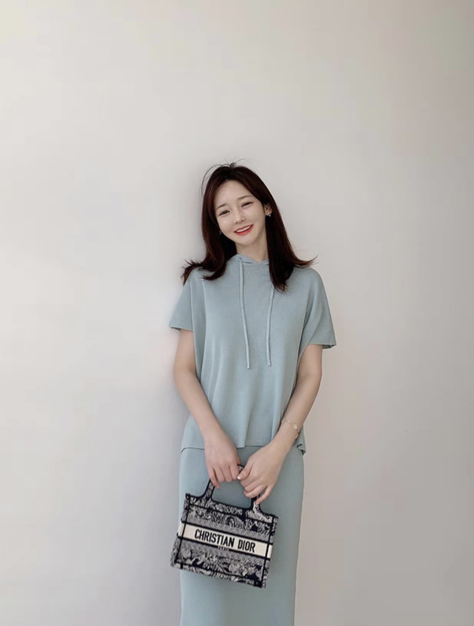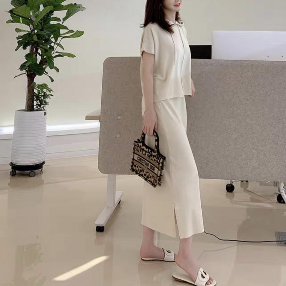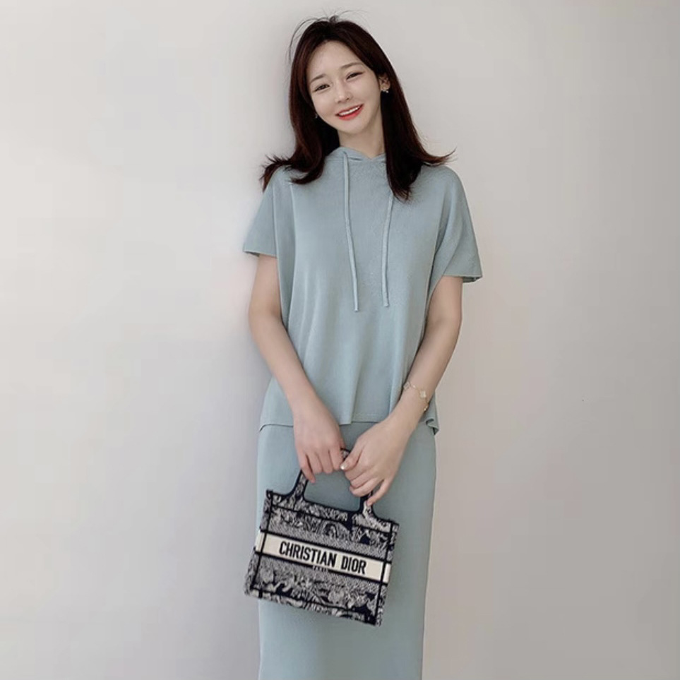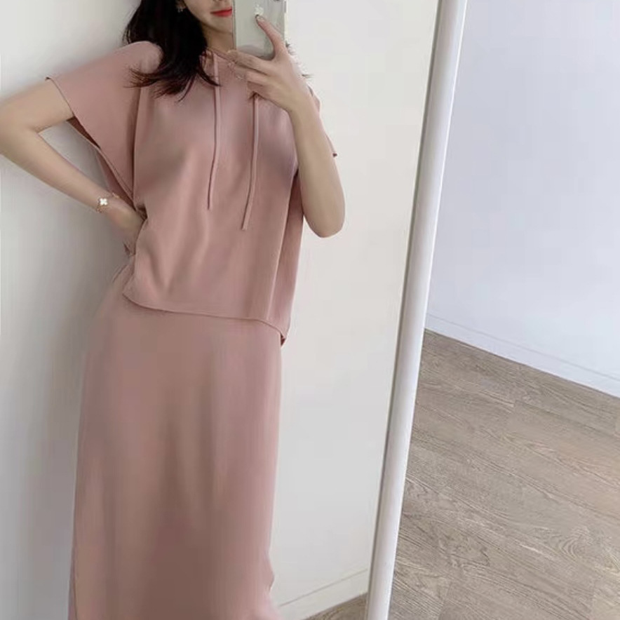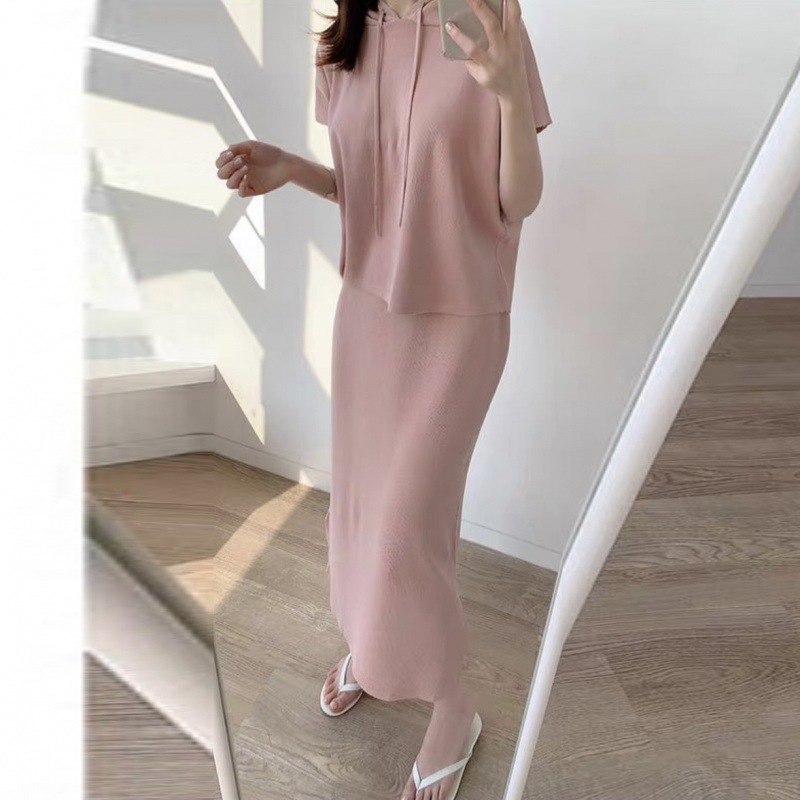 재고 한국 세련된 우아한 세트 여자의 여름 새로운 후드 탑 스플릿 하프 스커트 니트 투피스 세트