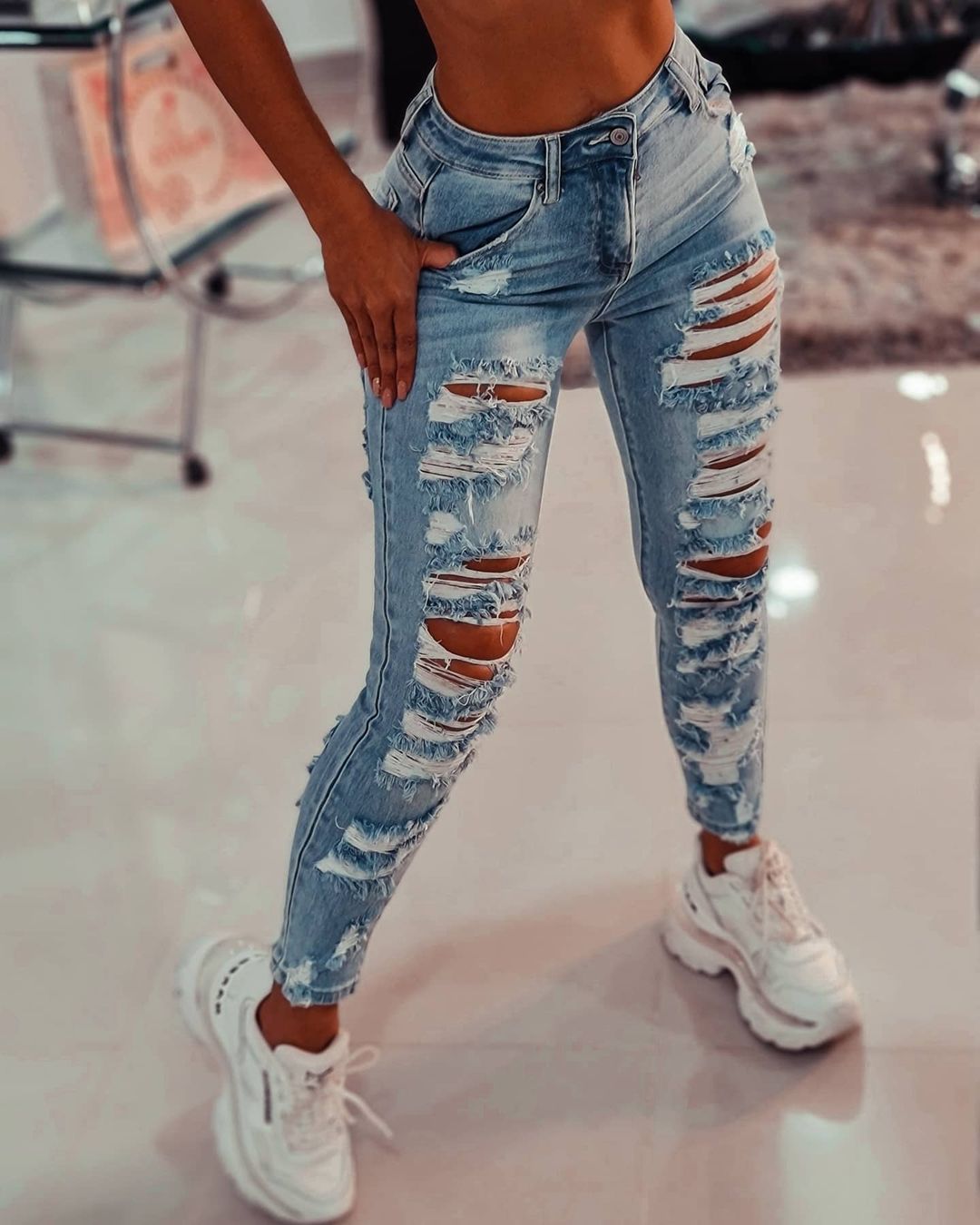2023 유럽과 미국 스트레치 찢어진 여성 청바지 아마존 핫 타이트 고탄성 패션 트렌드 펜슬 팬츠스토어 가기