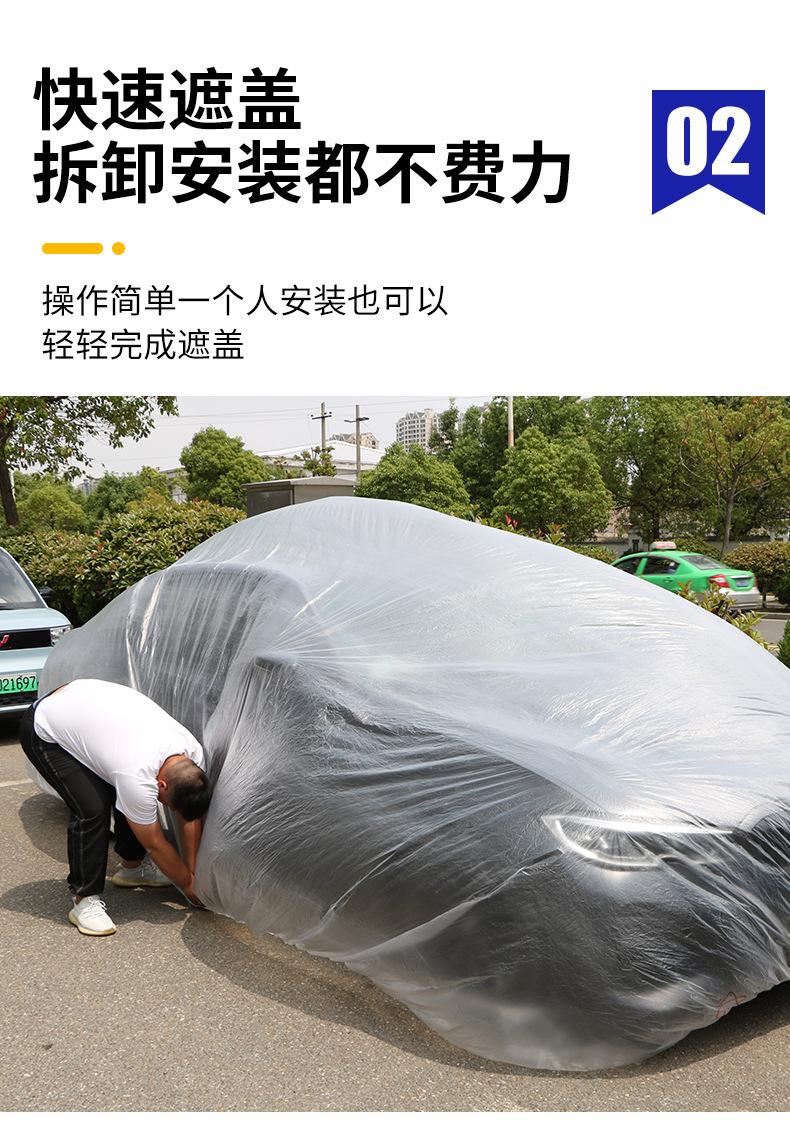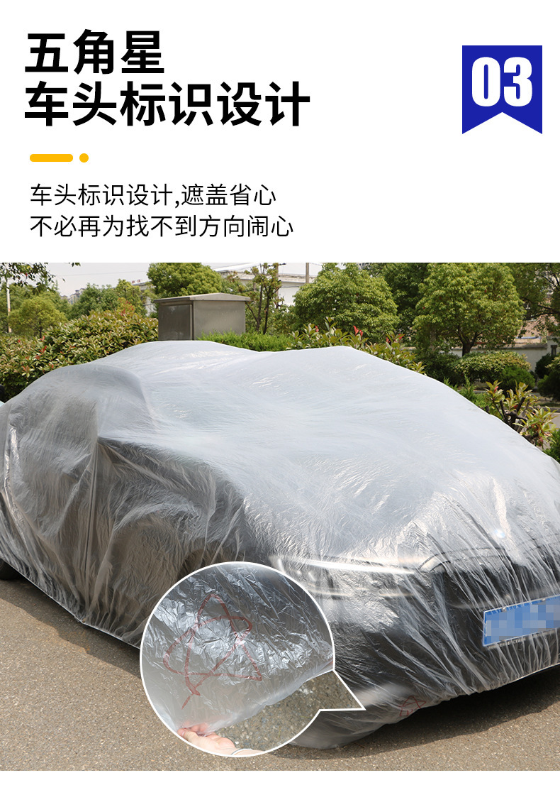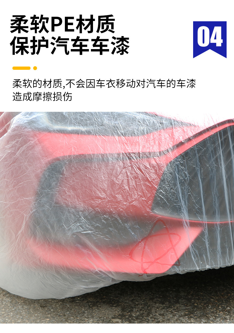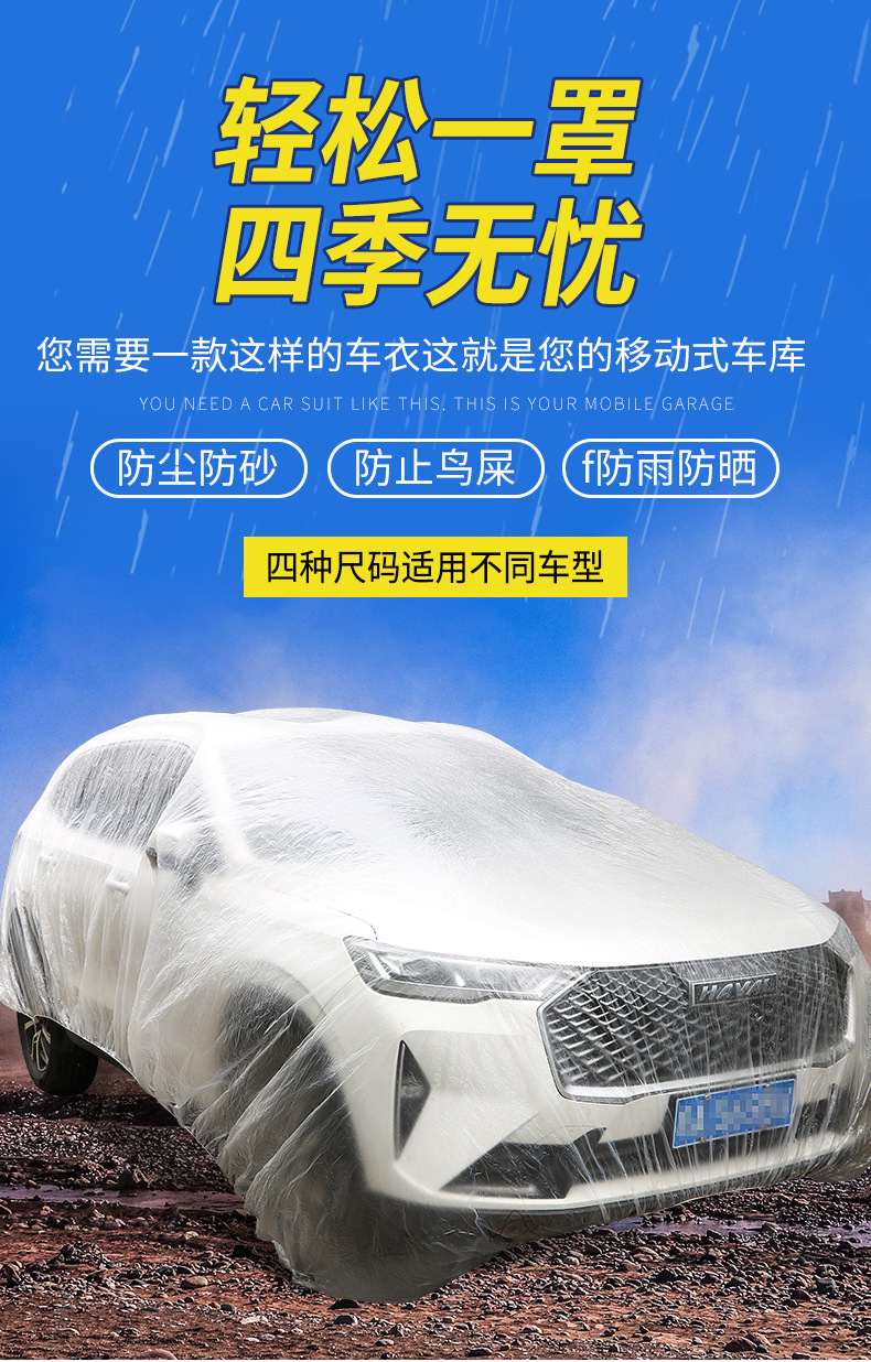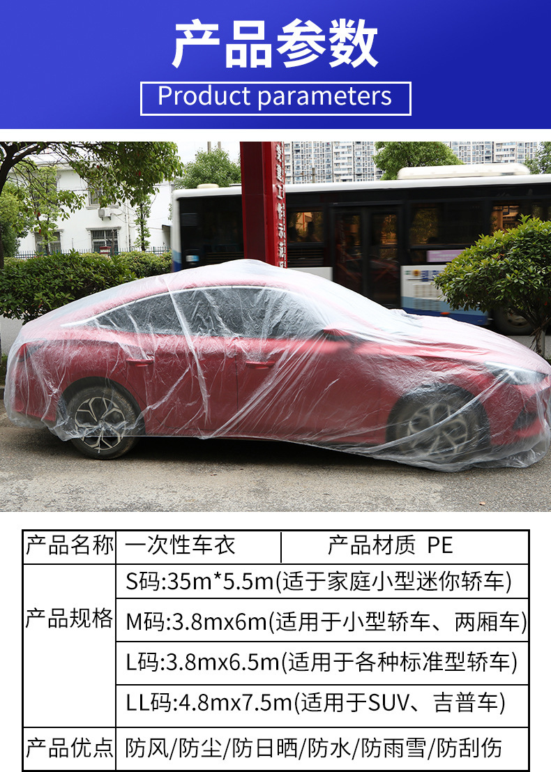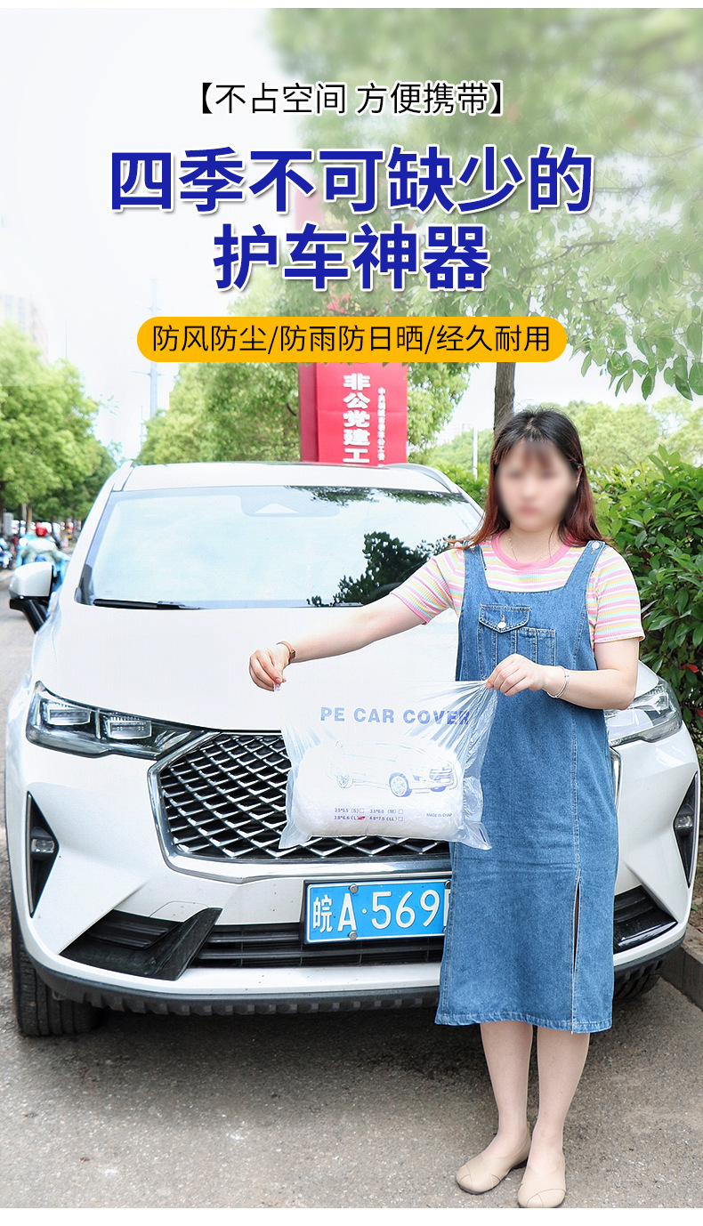 须知:本款车衣虽说是一次性的,但是我们用的料稍好,在竞品中算是中厚型的,轻拿轻放也可以重复使用多次。另外本品属于通用性质,非专车专用,不是说每辆车刚好吻合,属于凑合用的性质,购买建议,买大不买小。