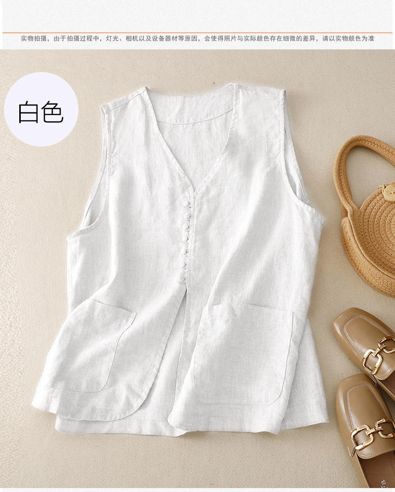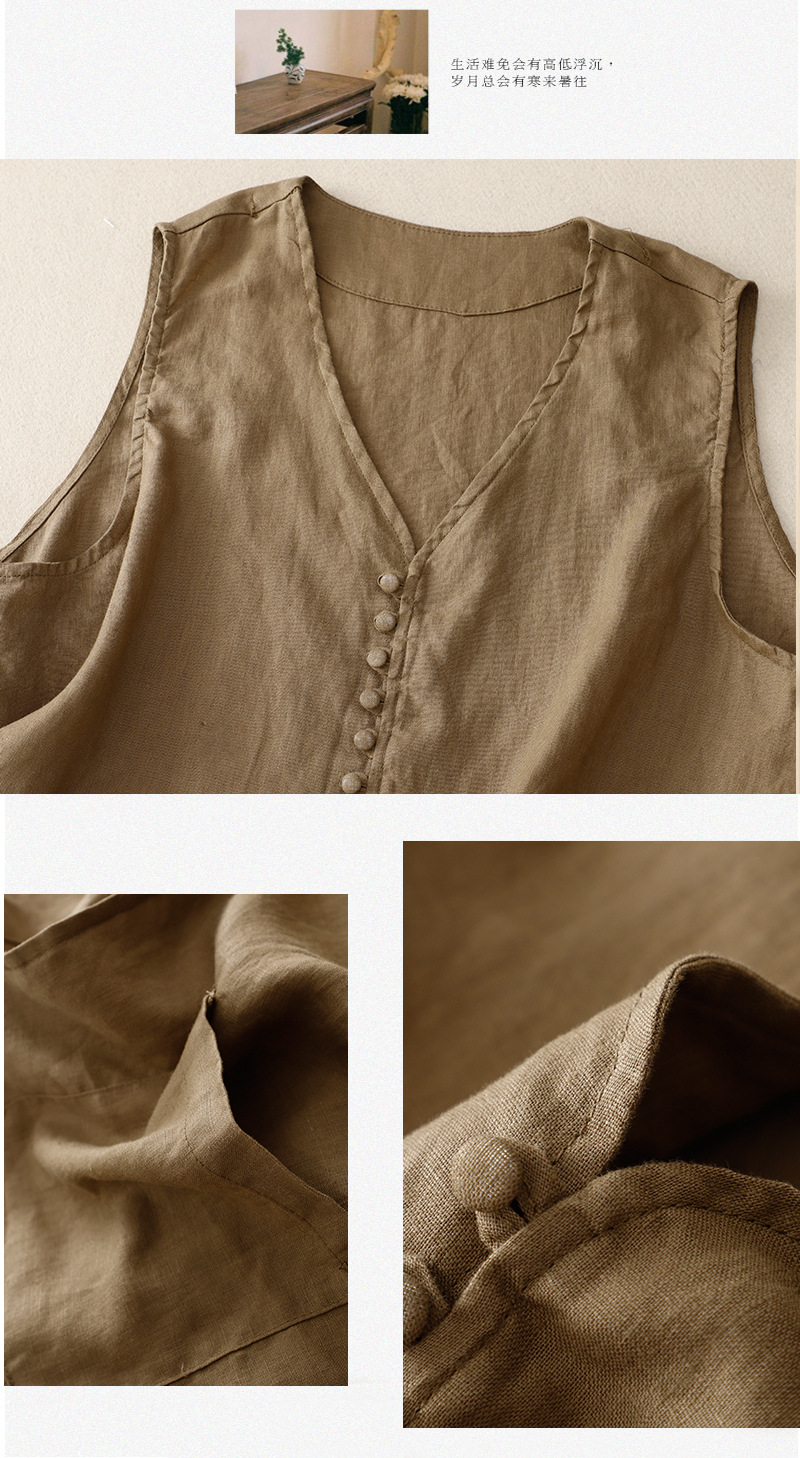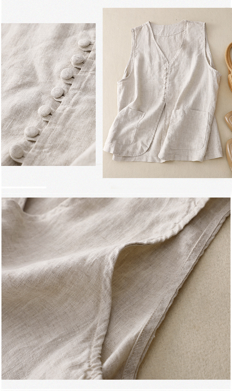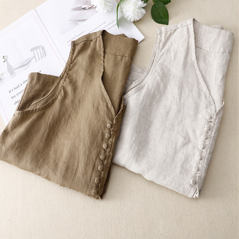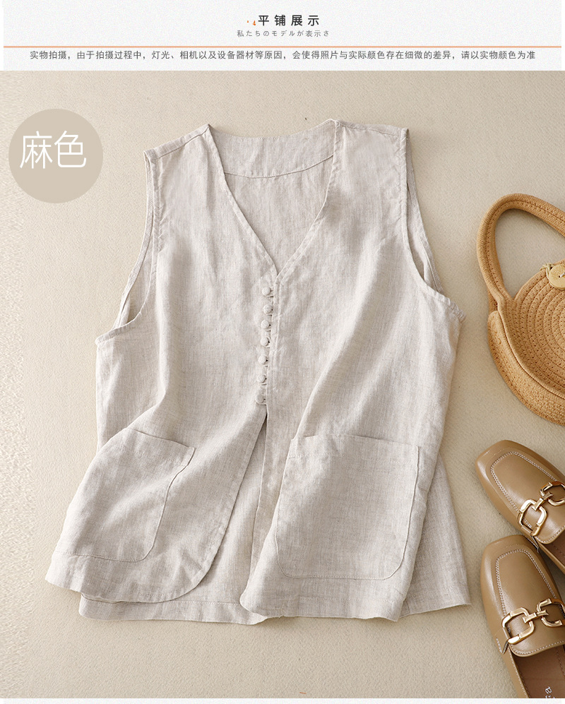 2025년 문학적 면 및 린넨 조끼 재킷의 실사 촬영 새로운 싱글 브레스트 레이어드 민소매 조끼 여성용 심플한 짧은 조끼스토어 가기