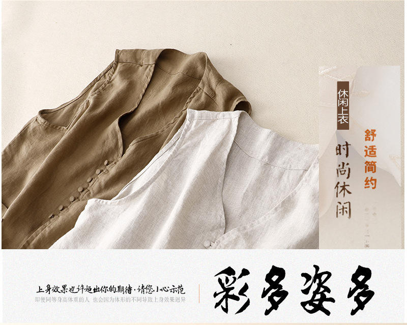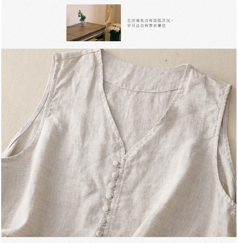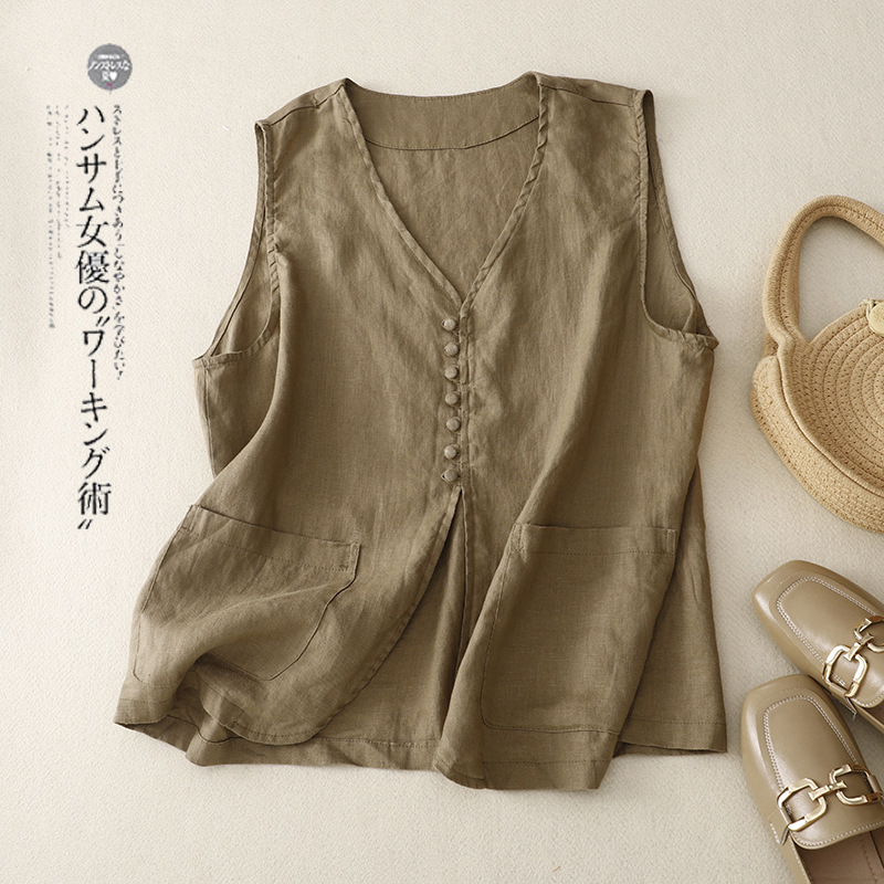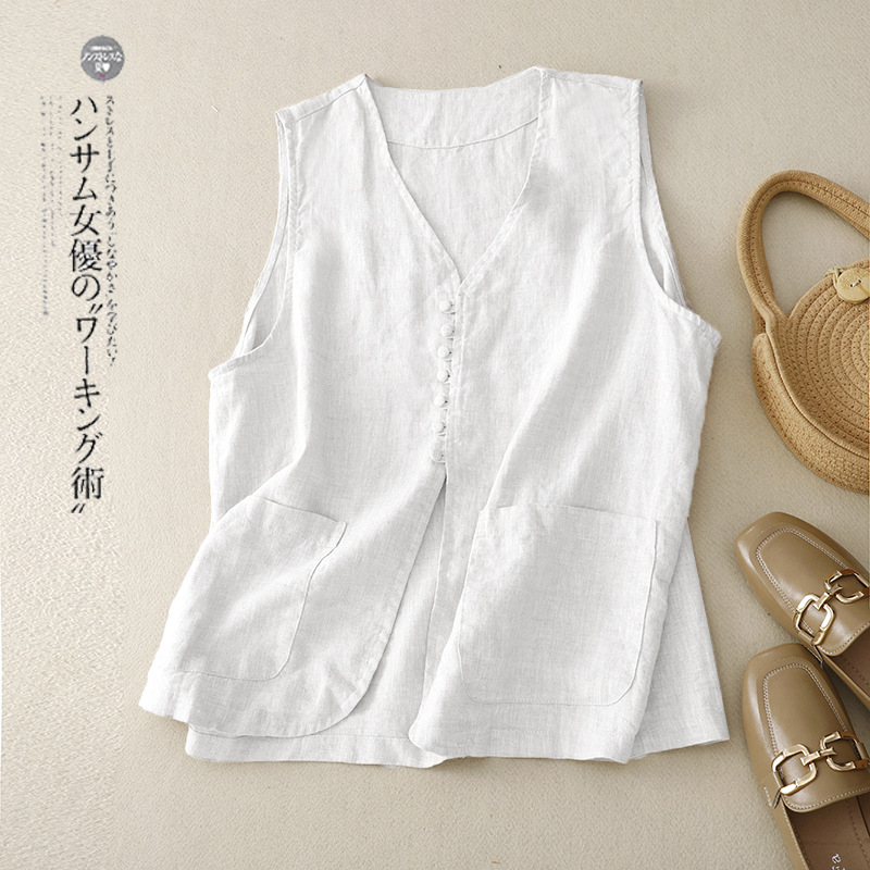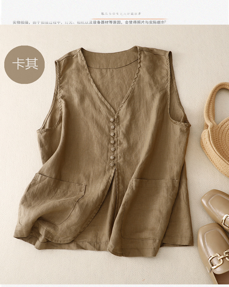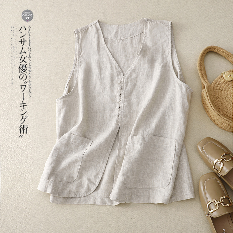 2025년 문학적 면 및 린넨 조끼 재킷의 실사 촬영 새로운 싱글 브레스트 레이어드 민소매 조끼 여성용 심플한 짧은 조끼스토어 가기