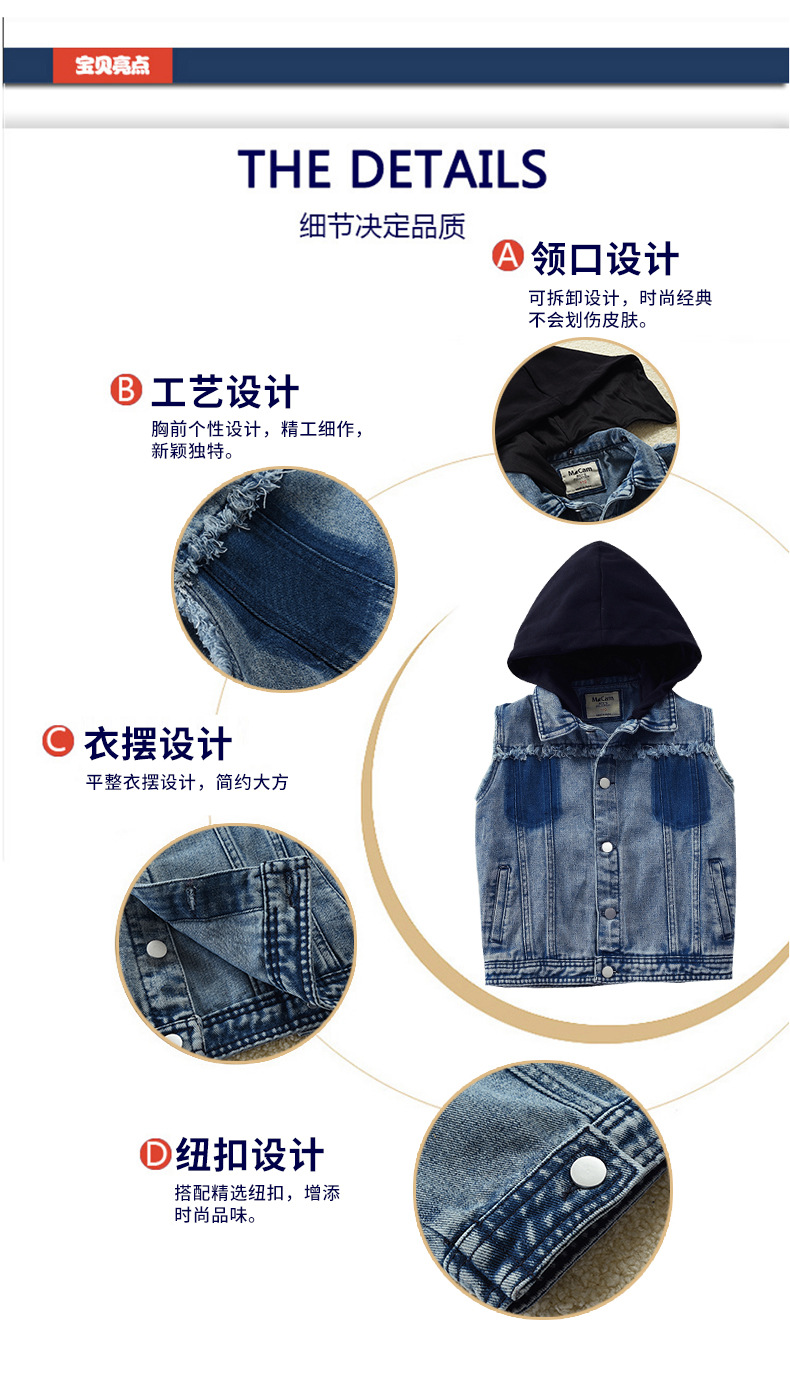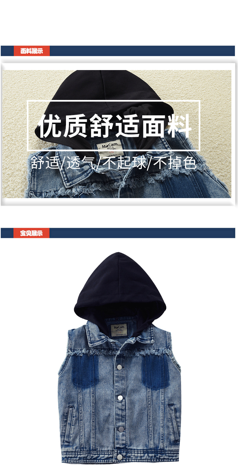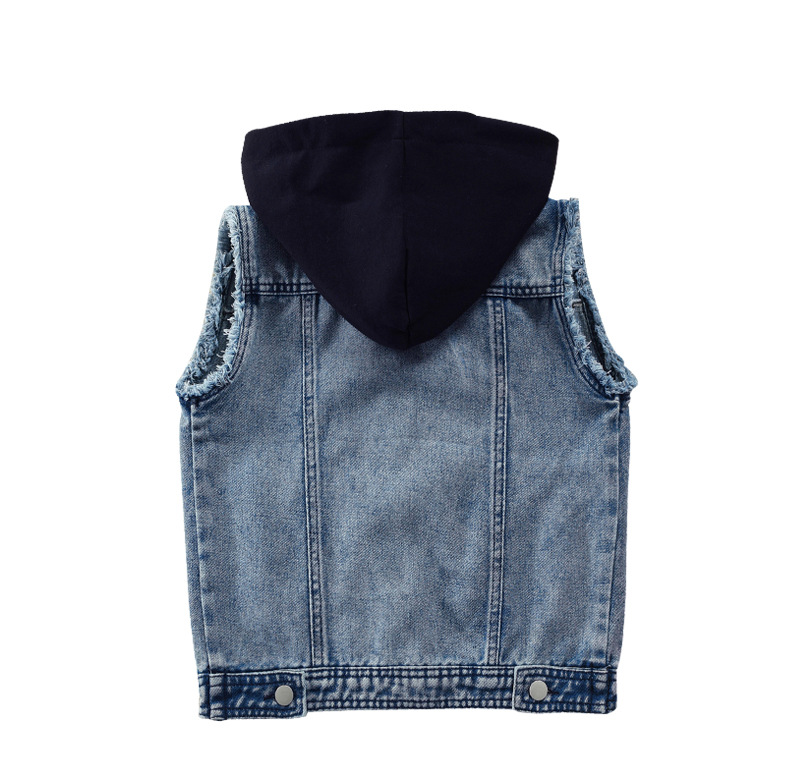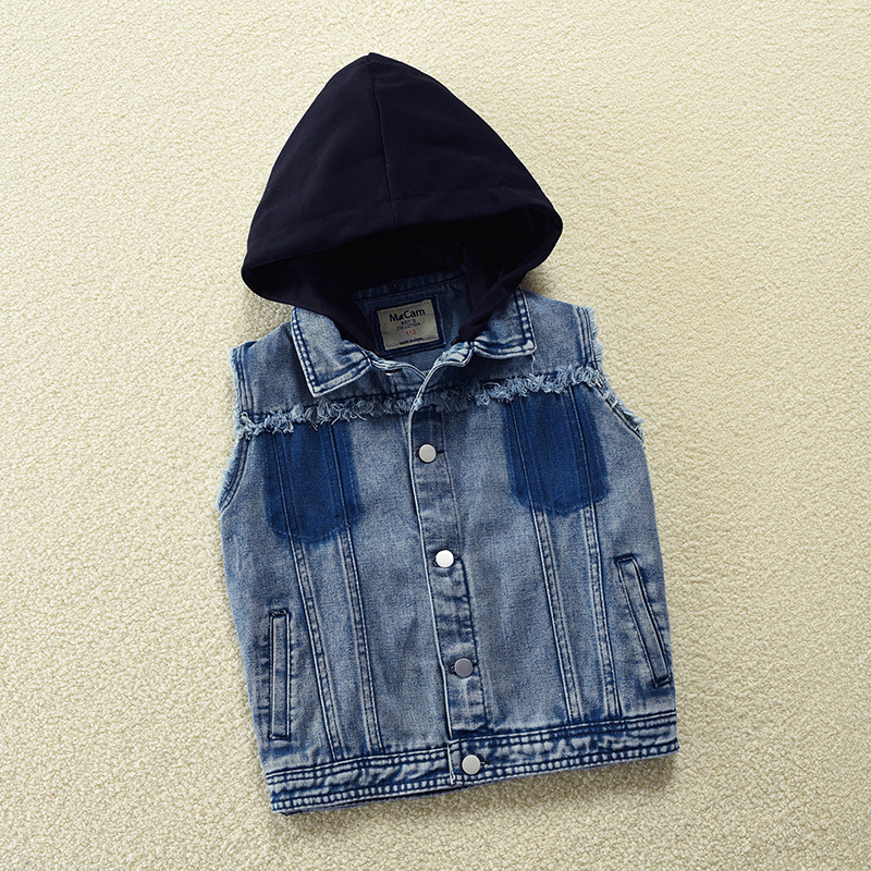 봄과 가을 새로운 아동복 소년의 데님 조끼 어린이 최고 캐주얼 유럽과 미국 어린이 중간 및 큰 어린이 조끼 후드
