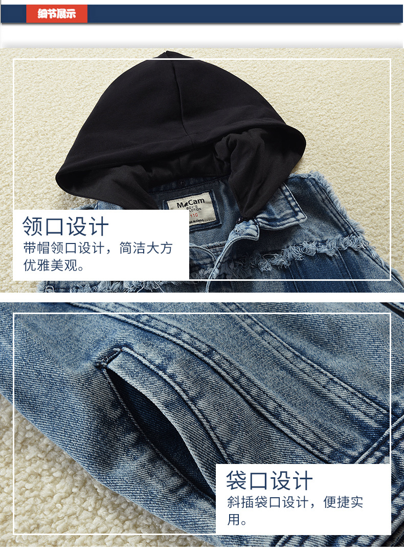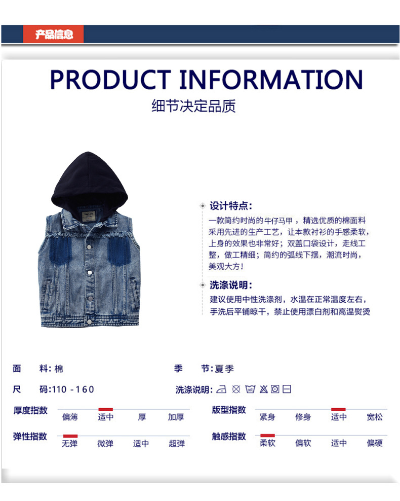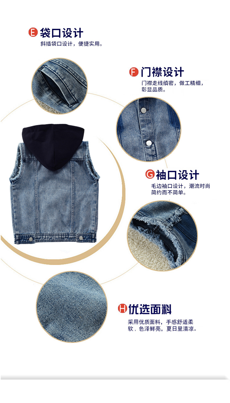 봄과 가을 새로운 아동복 소년의 데님 조끼 어린이 최고 캐주얼 유럽과 미국 어린이 중간 및 큰 어린이 조끼 후드