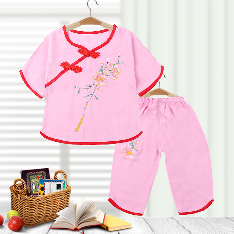 여자 잠옷 여름 면 실크 얇은 세트 실크 실크 여자 단색 자수 어린이 에어컨 가정 의류스토어 가기