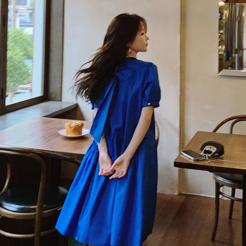 실제 촬영 2023 클라인 블루 원피스 여성의 여름 느슨한 프랑스 패션 스타일 질감 튀김 거리 임신 한 여자의 치마 조수스토어 가기