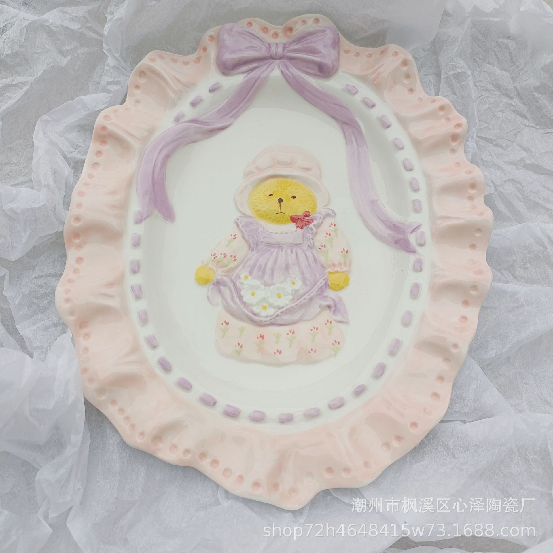 신선하고 귀여운 애프터눈 티 소녀의 하트 보우 레이스 손으로 그린 언더 글레이즈 세라믹 접시 디너 플레이트