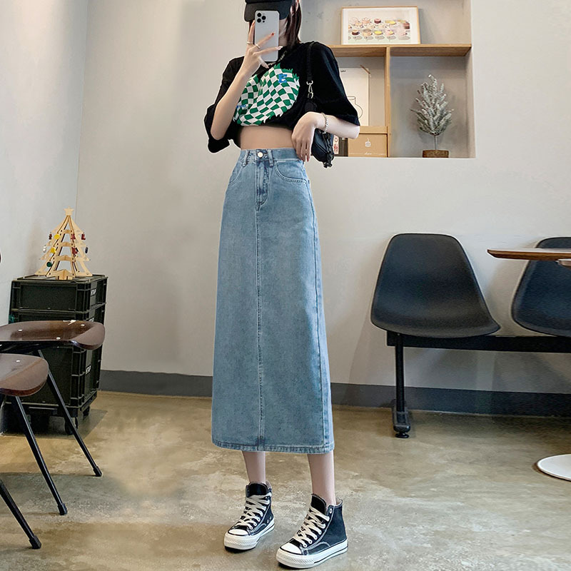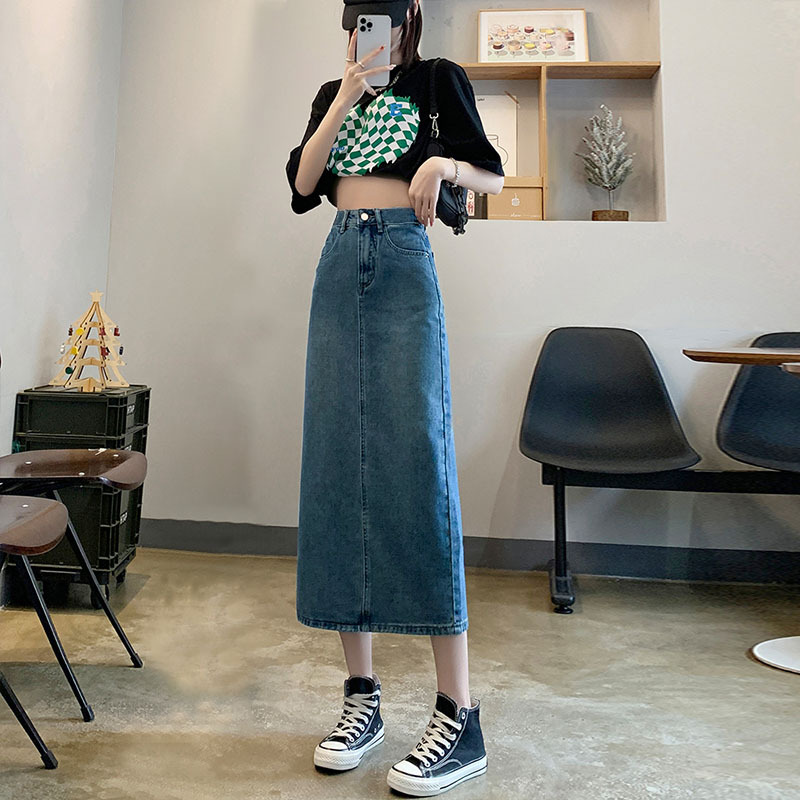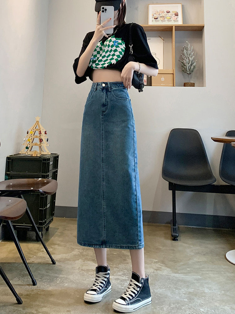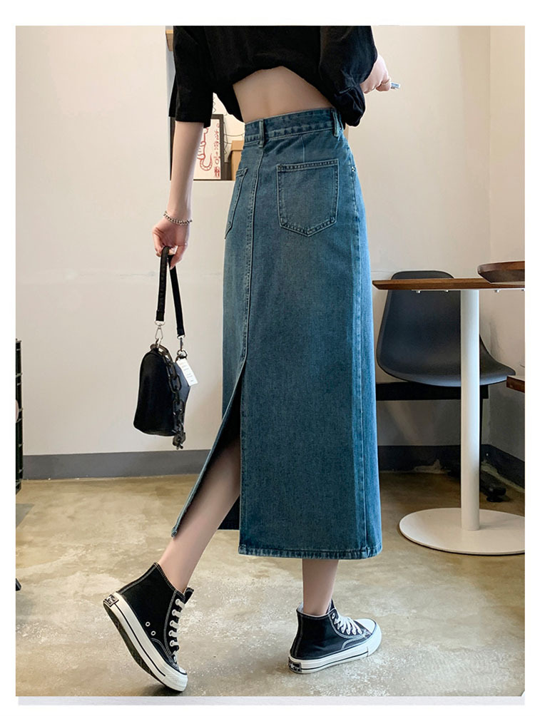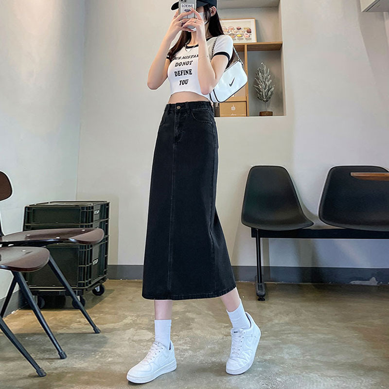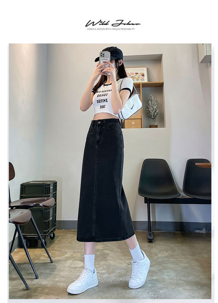 봄 여자의 중간 길이 치마 하이 웨이스트 슬림 A 라인 스커트 2023 봄 새로운 데님 분할 반 길이 스커트
