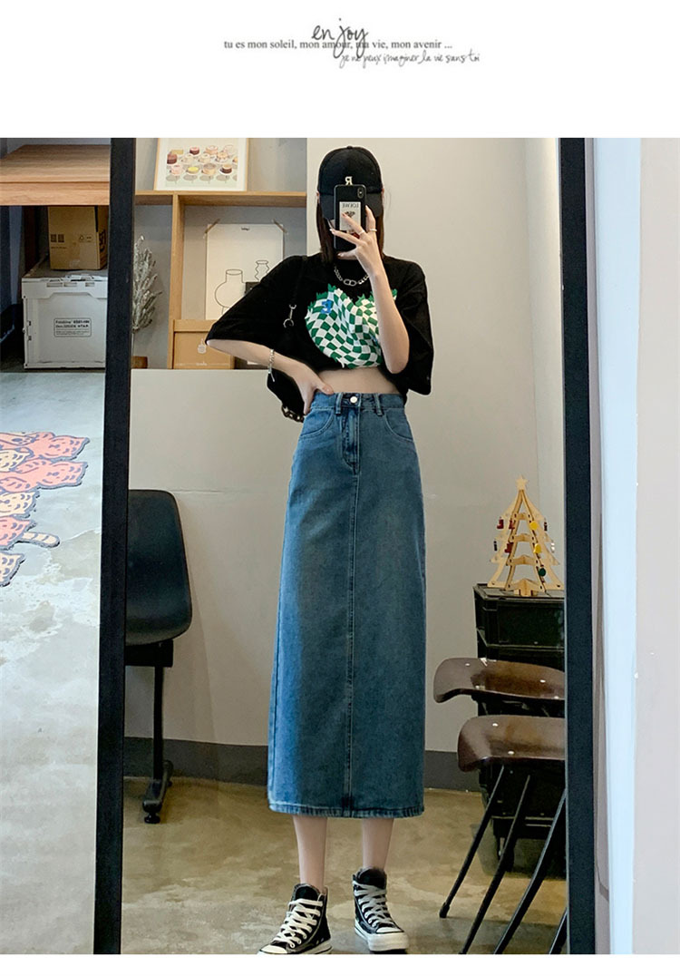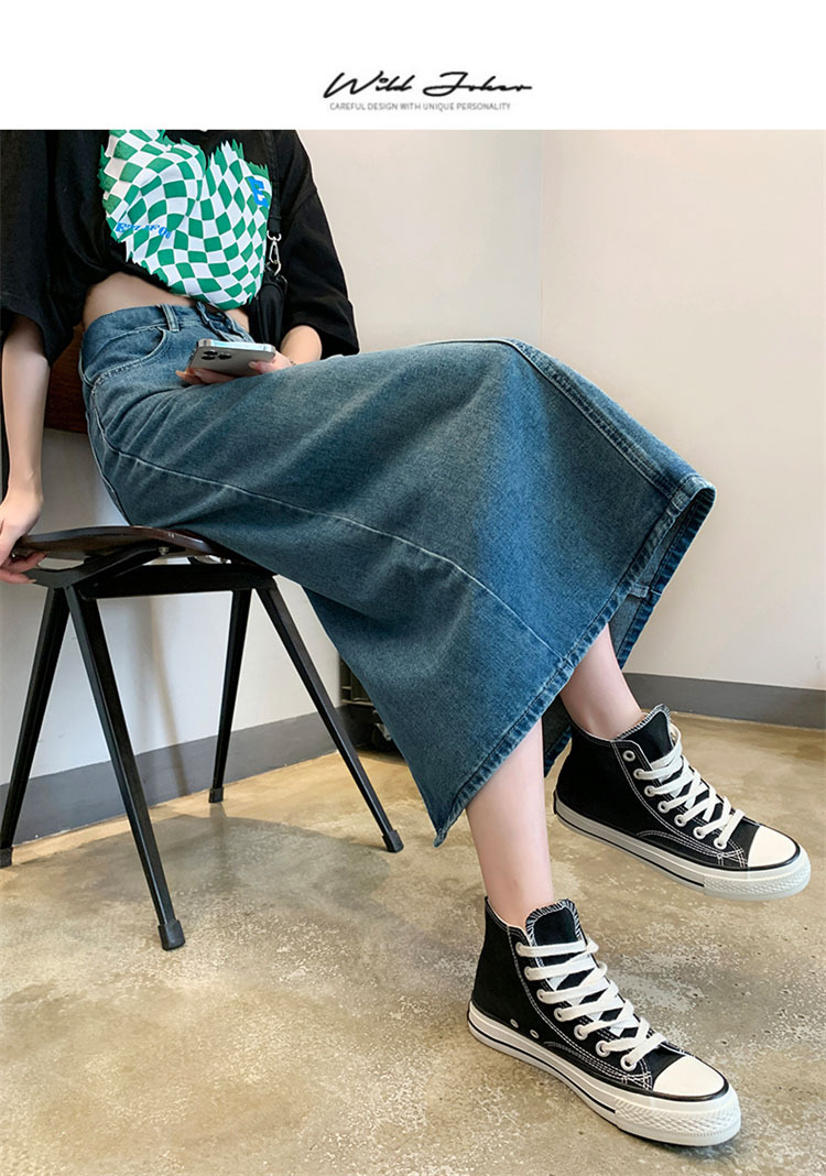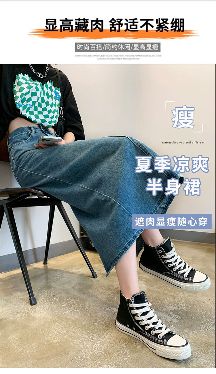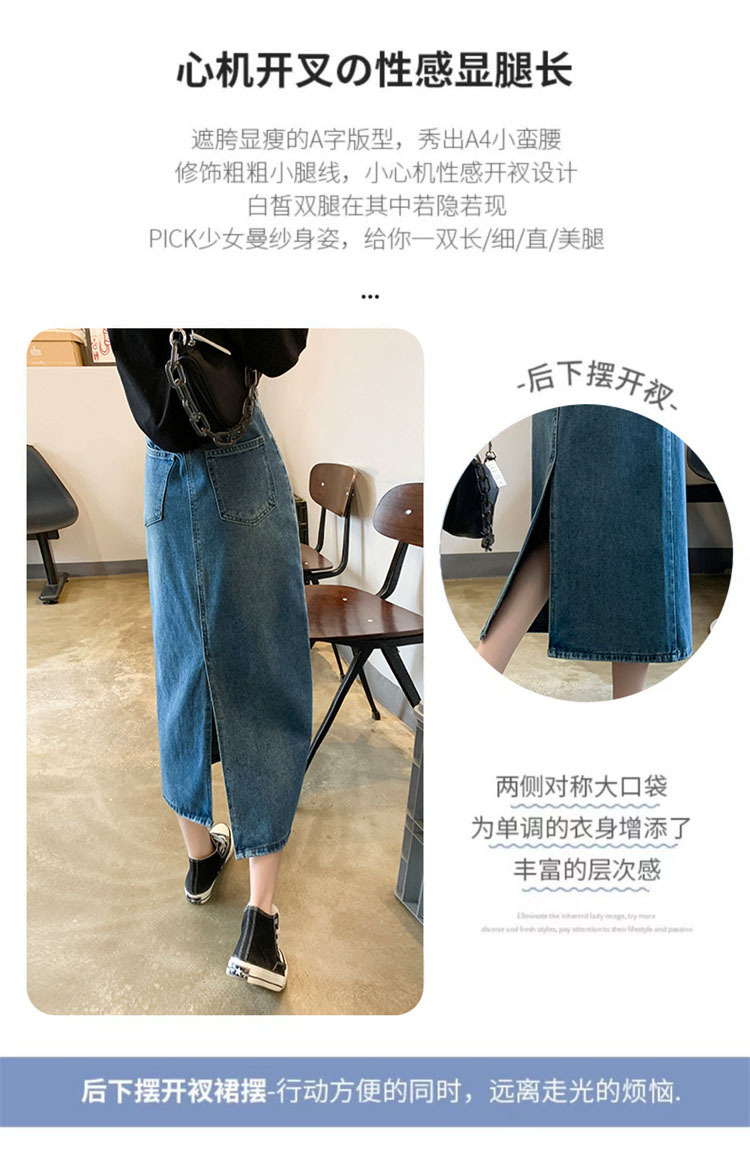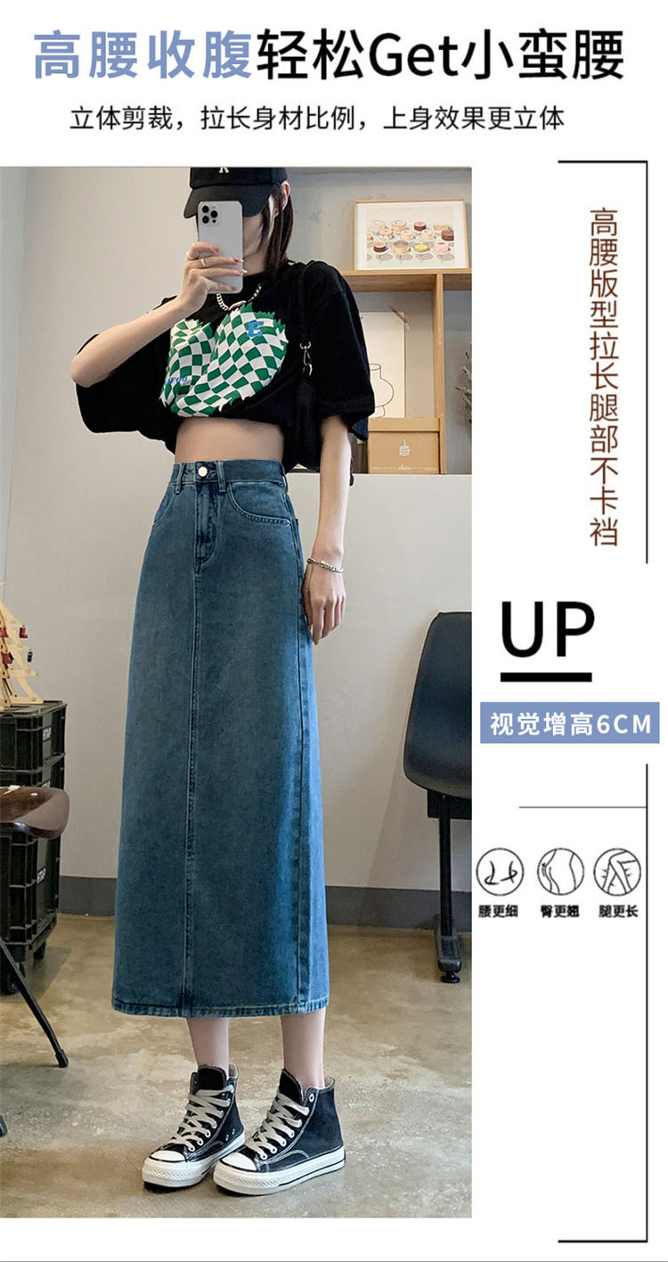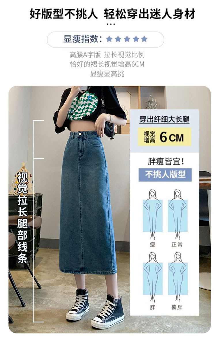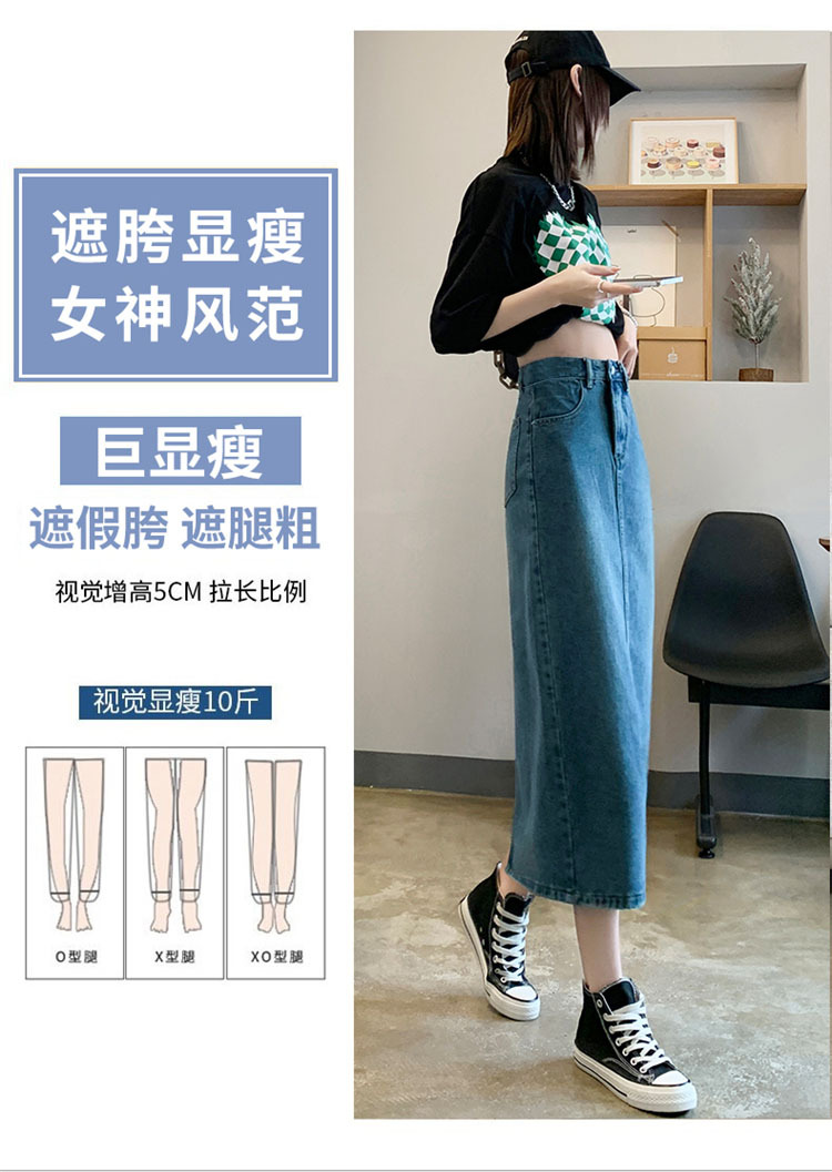 봄 여자의 중간 길이 치마 하이 웨이스트 슬림 A 라인 스커트 2023 봄 새로운 데님 분할 반 길이 스커트스토어 가기