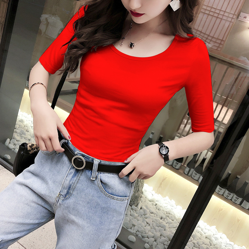중간 소매 티셔츠 여성용 세븐 슬리브 여름 2024 새로운 슬림 핏 플러스 사이즈 화이트 라운드 넥 반소매 내부 낮은 목 탑