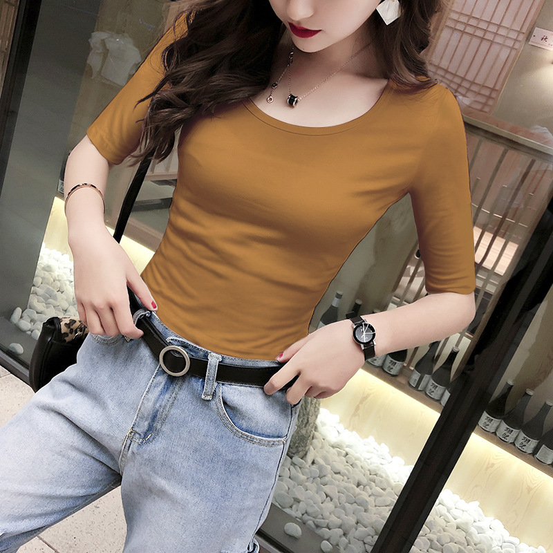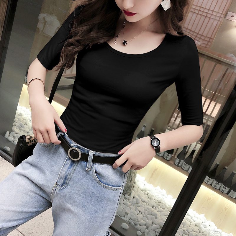 중간 소매 티셔츠 여성용 세븐 슬리브 여름 2024 새로운 슬림 핏 플러스 사이즈 화이트 라운드 넥 반소매 내부 낮은 목 탑스토어 가기