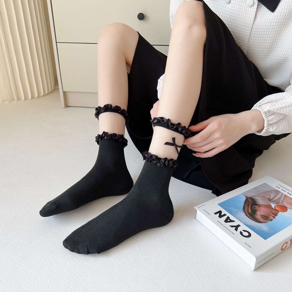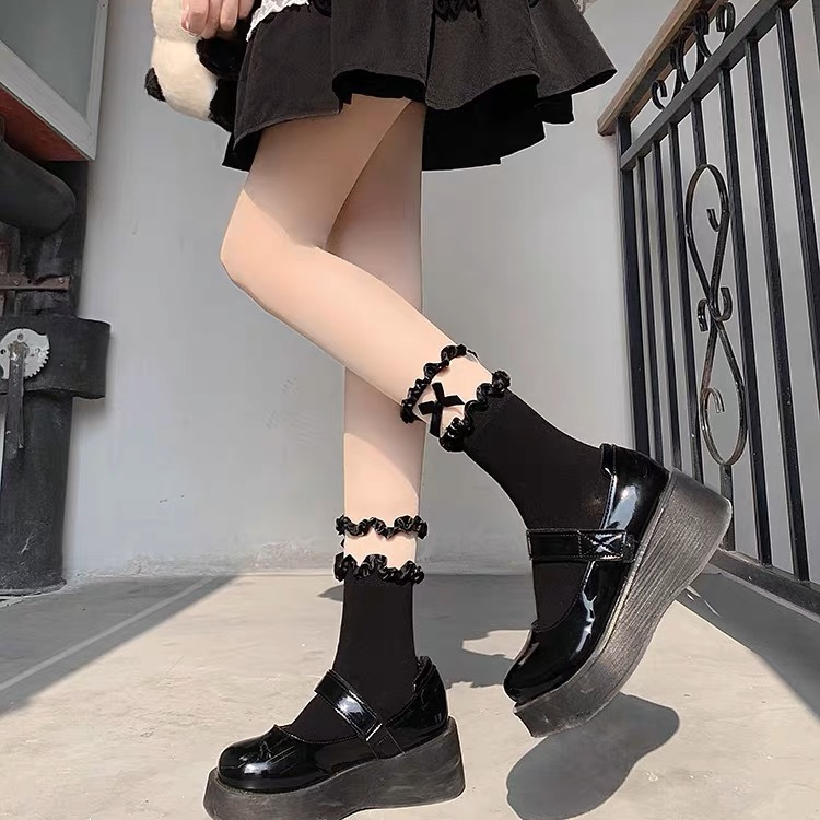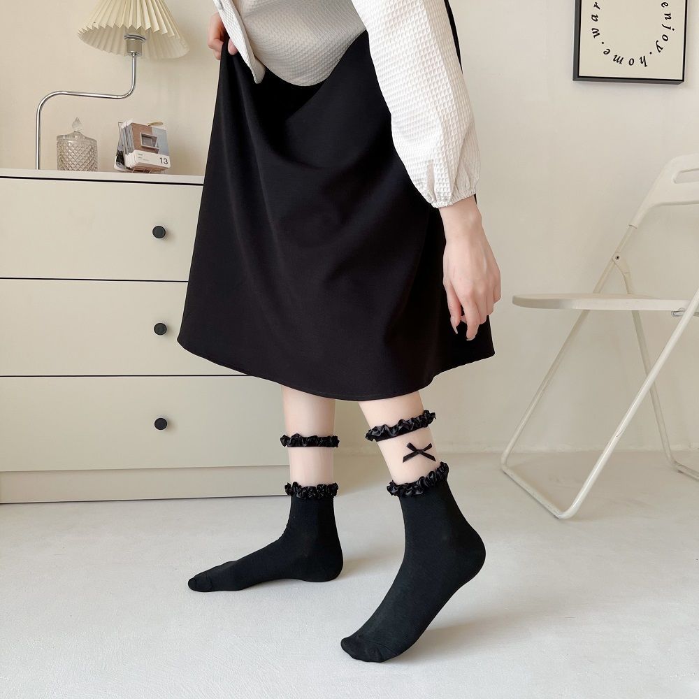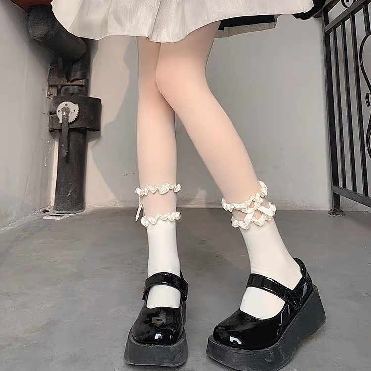작은 빨간 책 같은 스타일 흑백 끈 양말 어린이 활 중간 길이 양말 얇은 작은 가죽 신발 jk 양말 로리타스토어 가기
