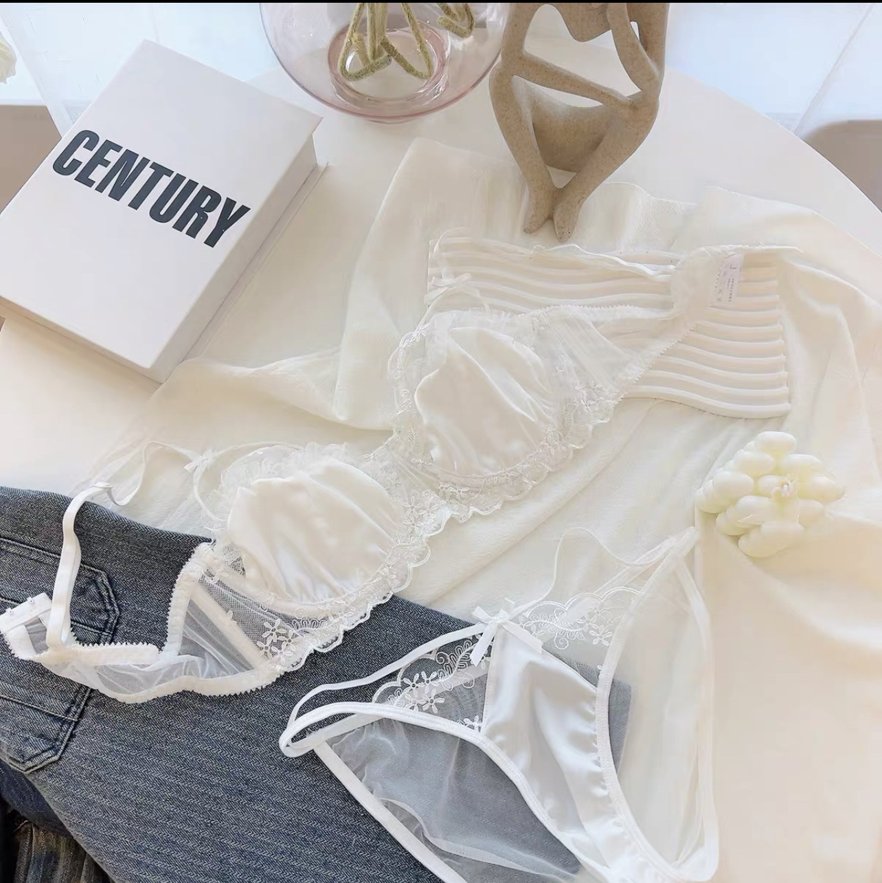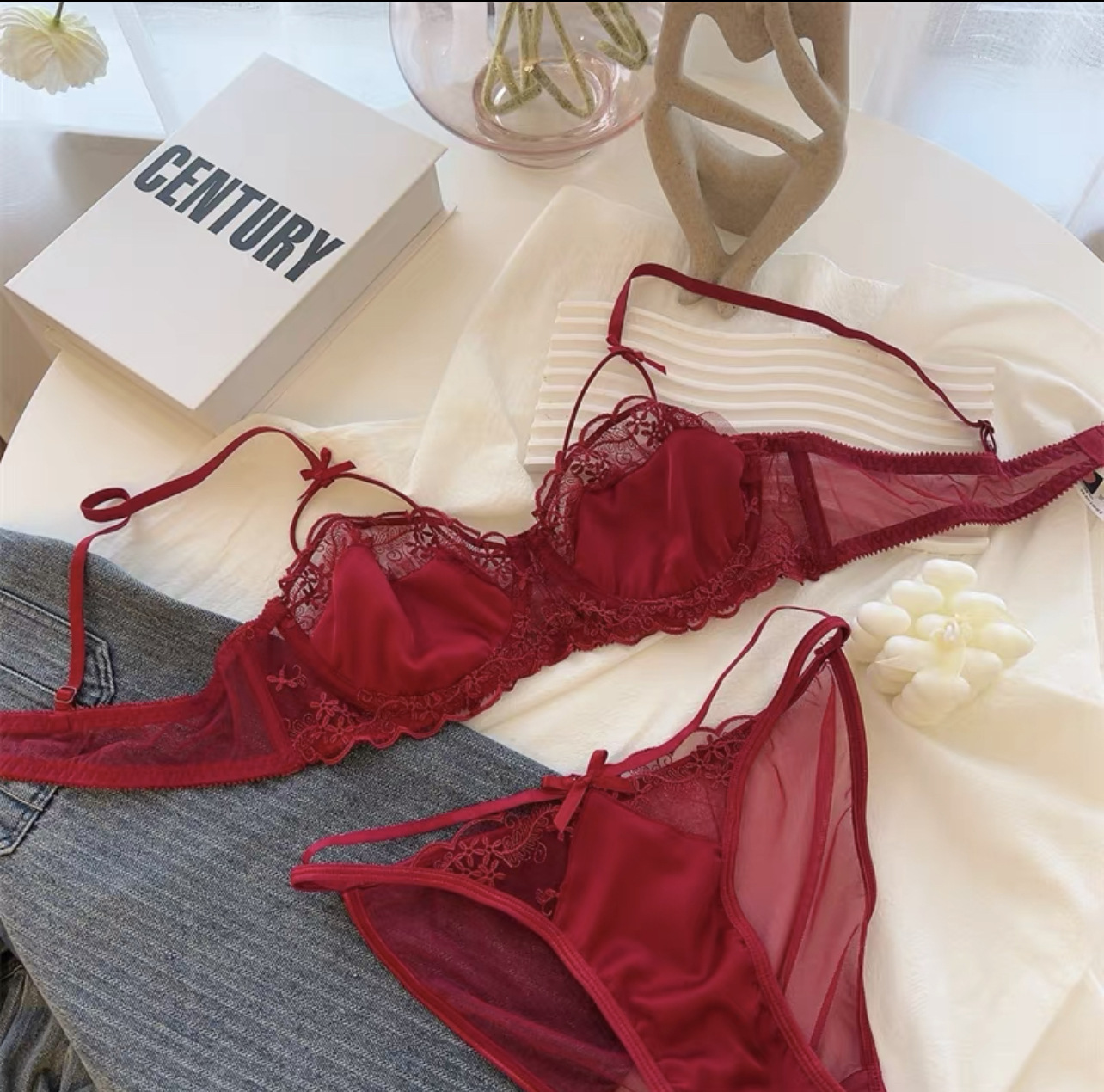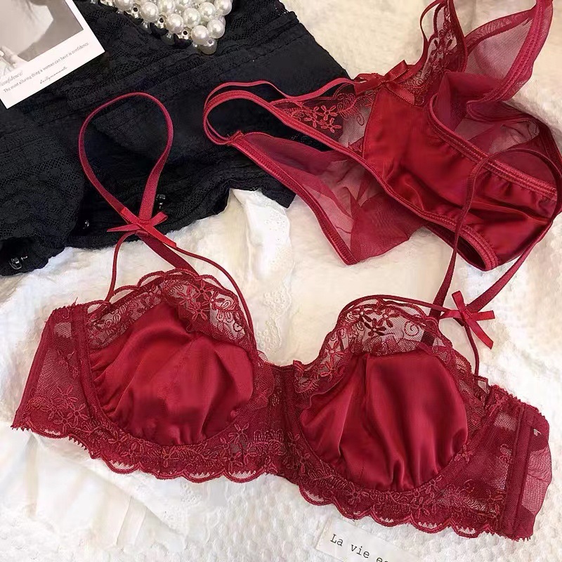 프랑스 스타일 순수 섹시 울트라 얇은 레이스 반 컵 새틴 중공 속옷 세트 큰 가슴 작은 여성 부드러운 스틸 링 브래지어